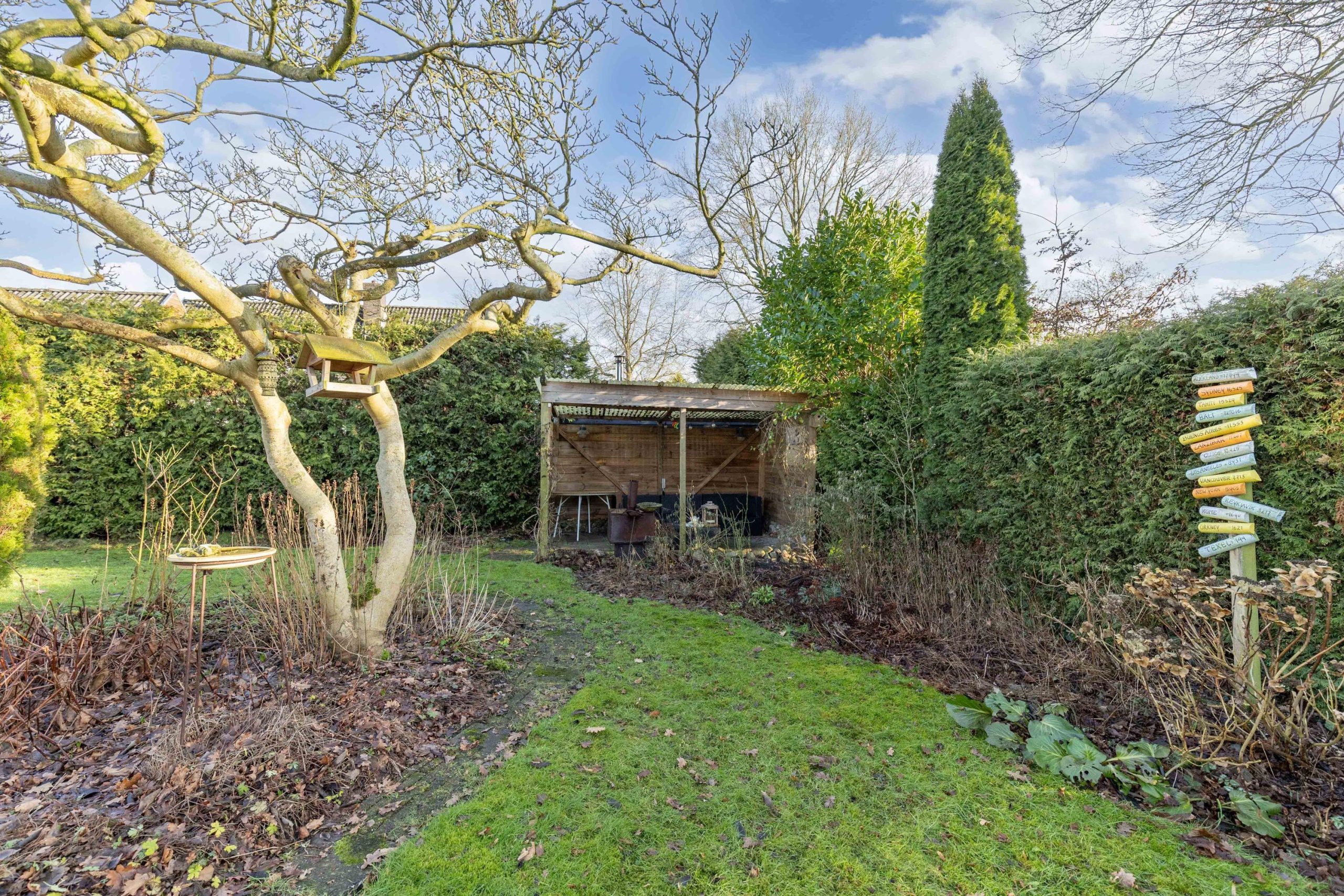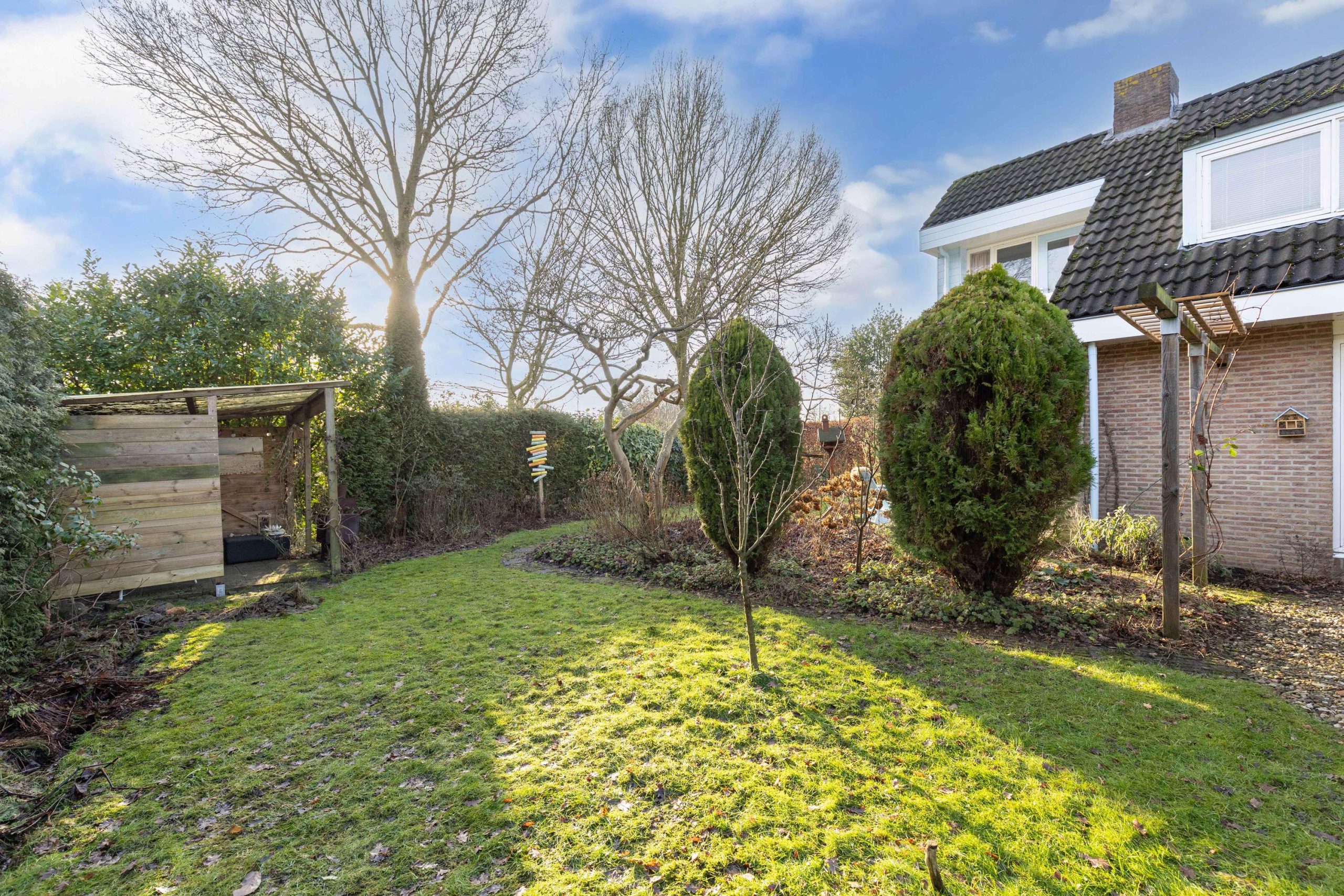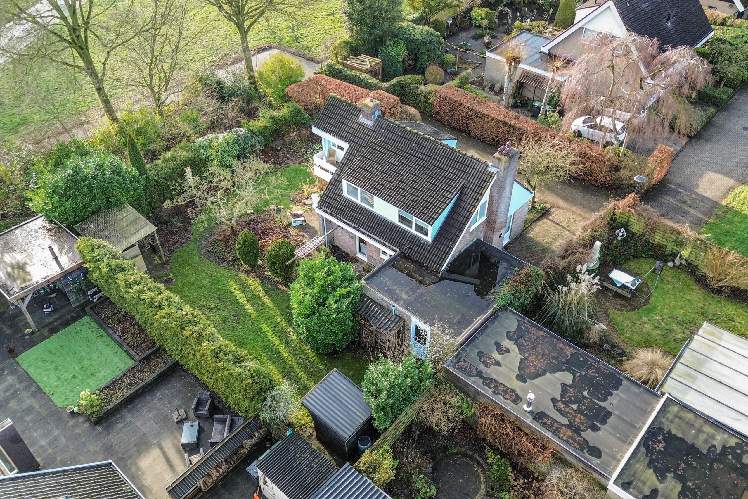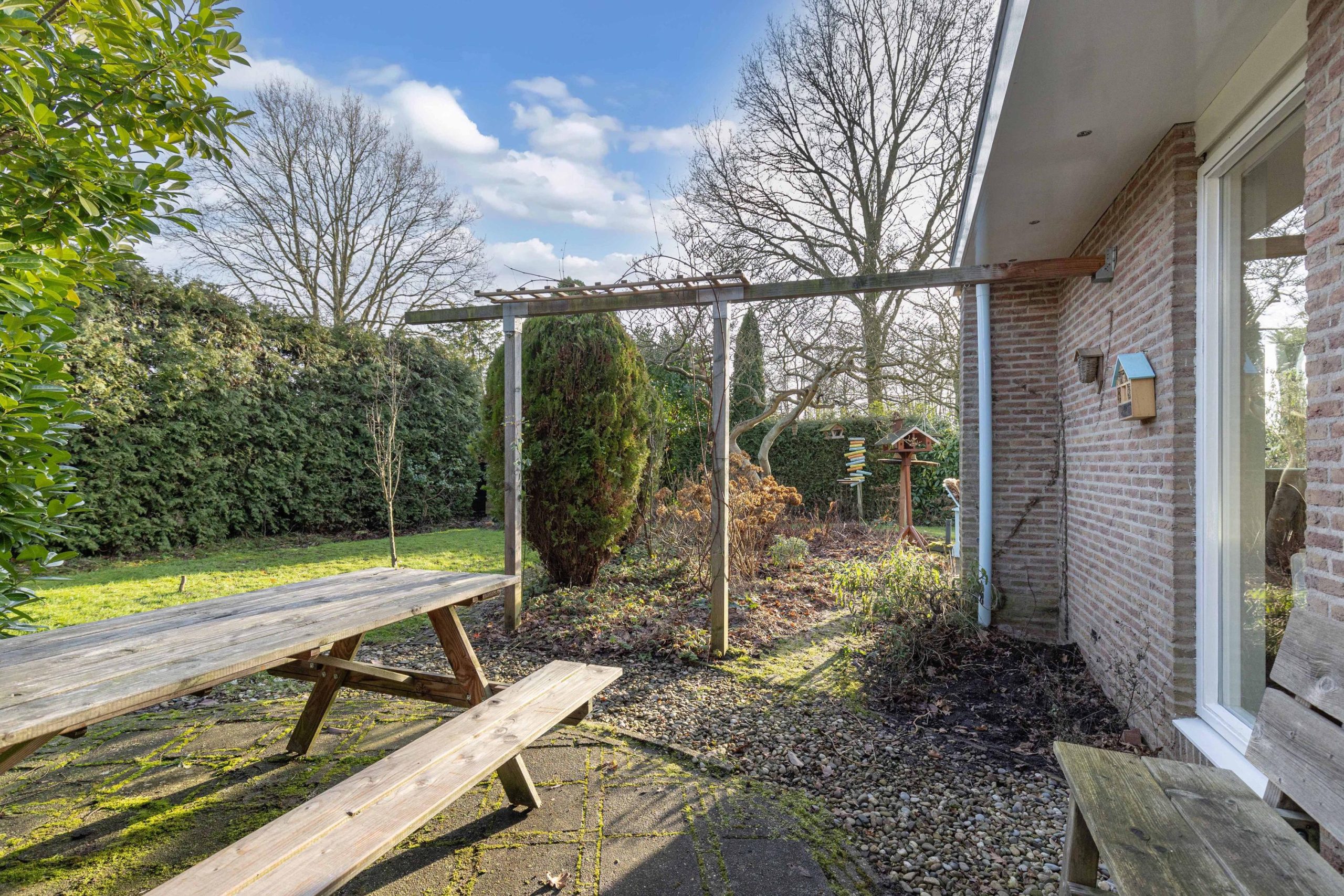 Het woonhuis wordt omzoomd door een verzorgd aangelegde tuin met terrassen, gazon, heesters en groene borders. De magnolia in de tuin staat in het voorjaar prachtig in bloei! De achtertuin is op het zuiden georiënteerd waardoor je volop kunt genieten van de zon. De overkapping geeft je een schaduwplekje en een heerlijk zithoekje waar je kunt genieten van de rust en zicht op de tuin. Voor de tuinspullen is een kleine houten berging. Aan de zuid- en westzijde grenst de tuin aan gemeentegroen en voetpad, waardoor je extra veel privacy hebt. Voor de garage is een oprit voor de auto.