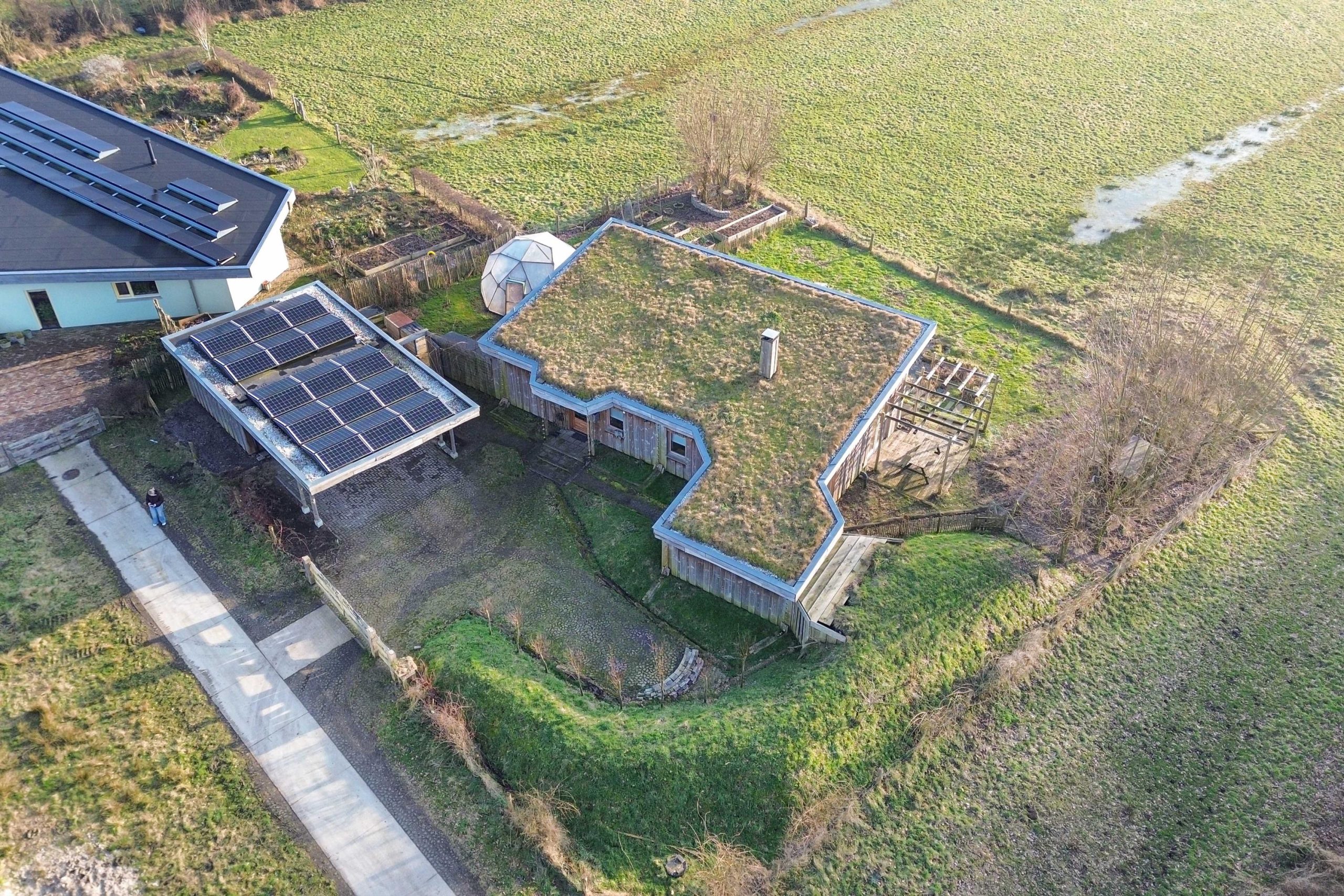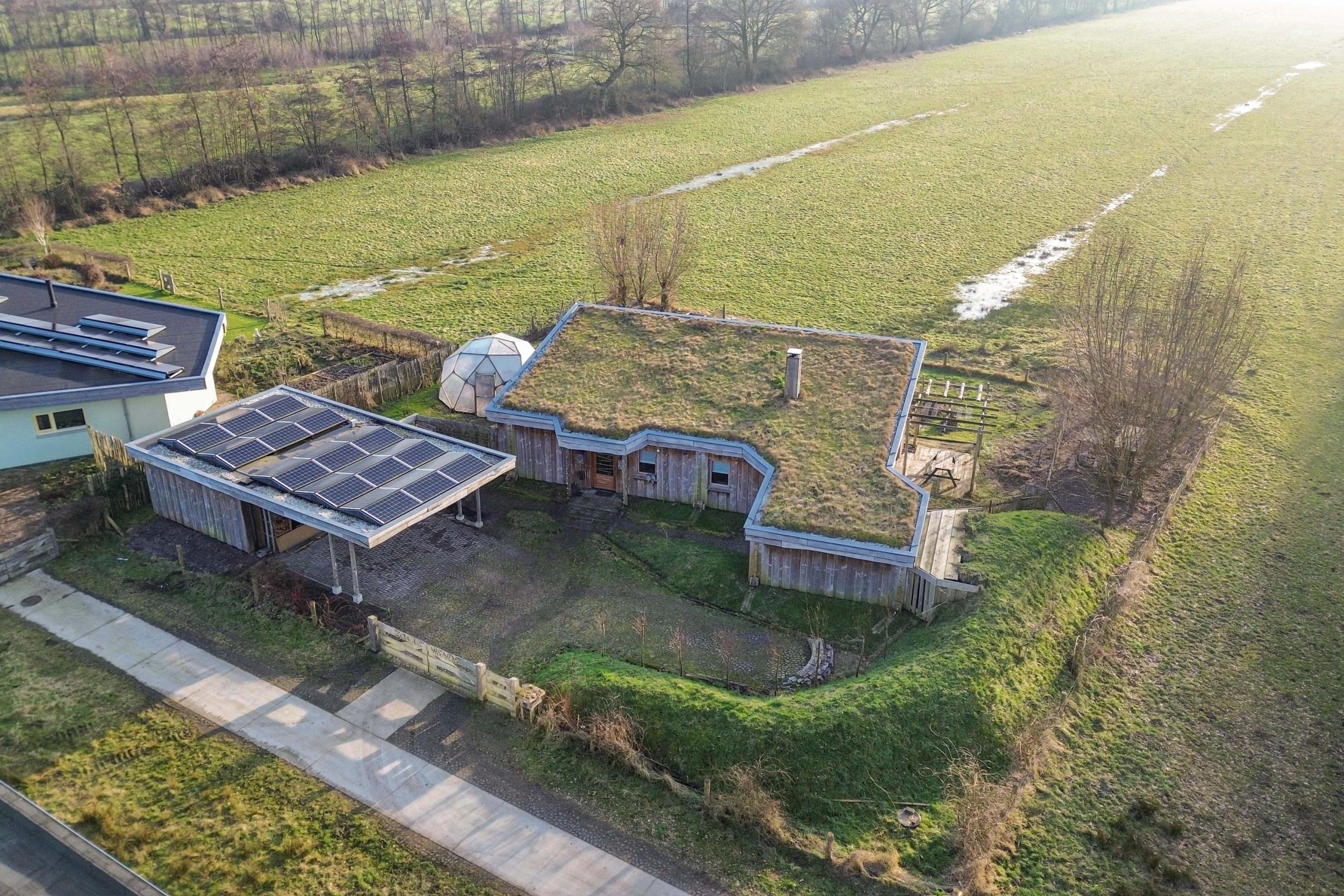 Door een huis te bouwen ontneem neem je een stukje van de natuur, want waar het huis staat kan niks groeien en kunnen geen dieren leven. Met een grasdak geef je weer een stukje natuur terug. Het lijkt nu net alsof er een plakje aarde is opgetild en het huis er onder is geschoven. Op ons huis liggen 18 cm dikke zakken met turf/grond en daarin is gras gezaaid. Inmiddels groeien er ook al hele andere planten op het dak. De dikke laag turf/grond buffert het regenwater en laat het langzaam van het dak lopen. Fijn voor de natuur als het regenwater niet in 1 plons op het erf komt, maar er langzaam ter plaatse in weg kan zakken. Het water hoort op deze plek en hoort niet afgevoerd te worden. In die dikke laag turf/grond kunnen insecten wonen. Vogels lusten die wel en ook de zaden van de planten/bloemen die er op het dak groeien. De vogels brengen nieuwe zaden op het dak, poepen op het dak en zorgen zo voor voedingsstoffen voor de planten en bloemen die er op leven. Het is een mooie kringloop.