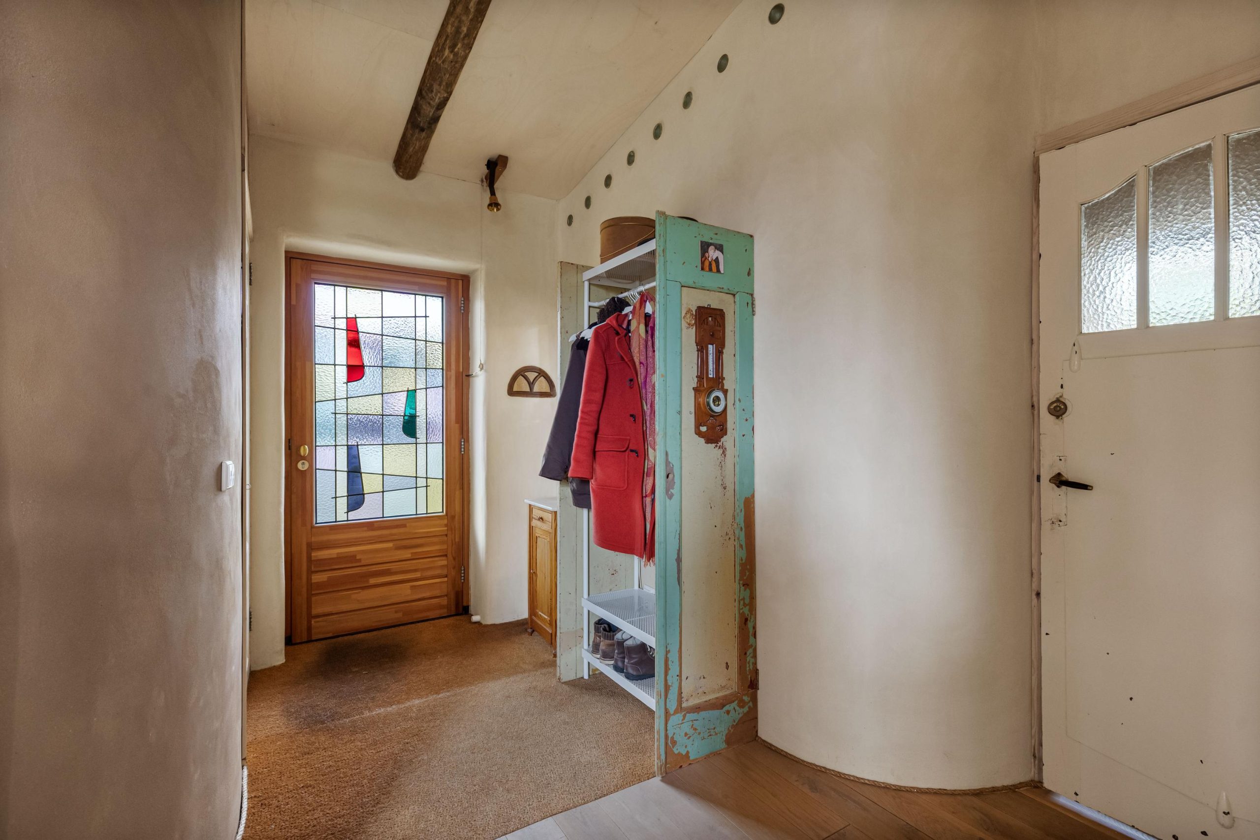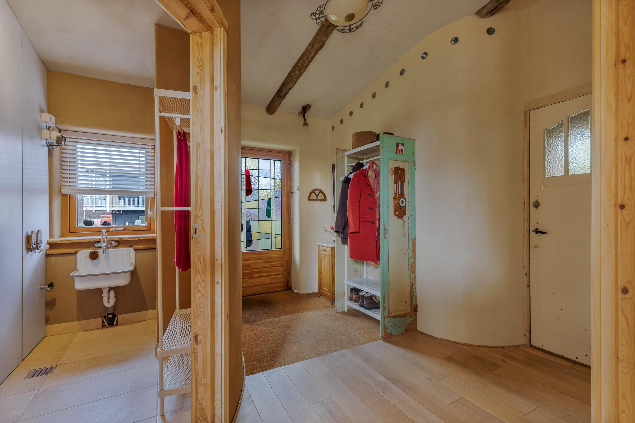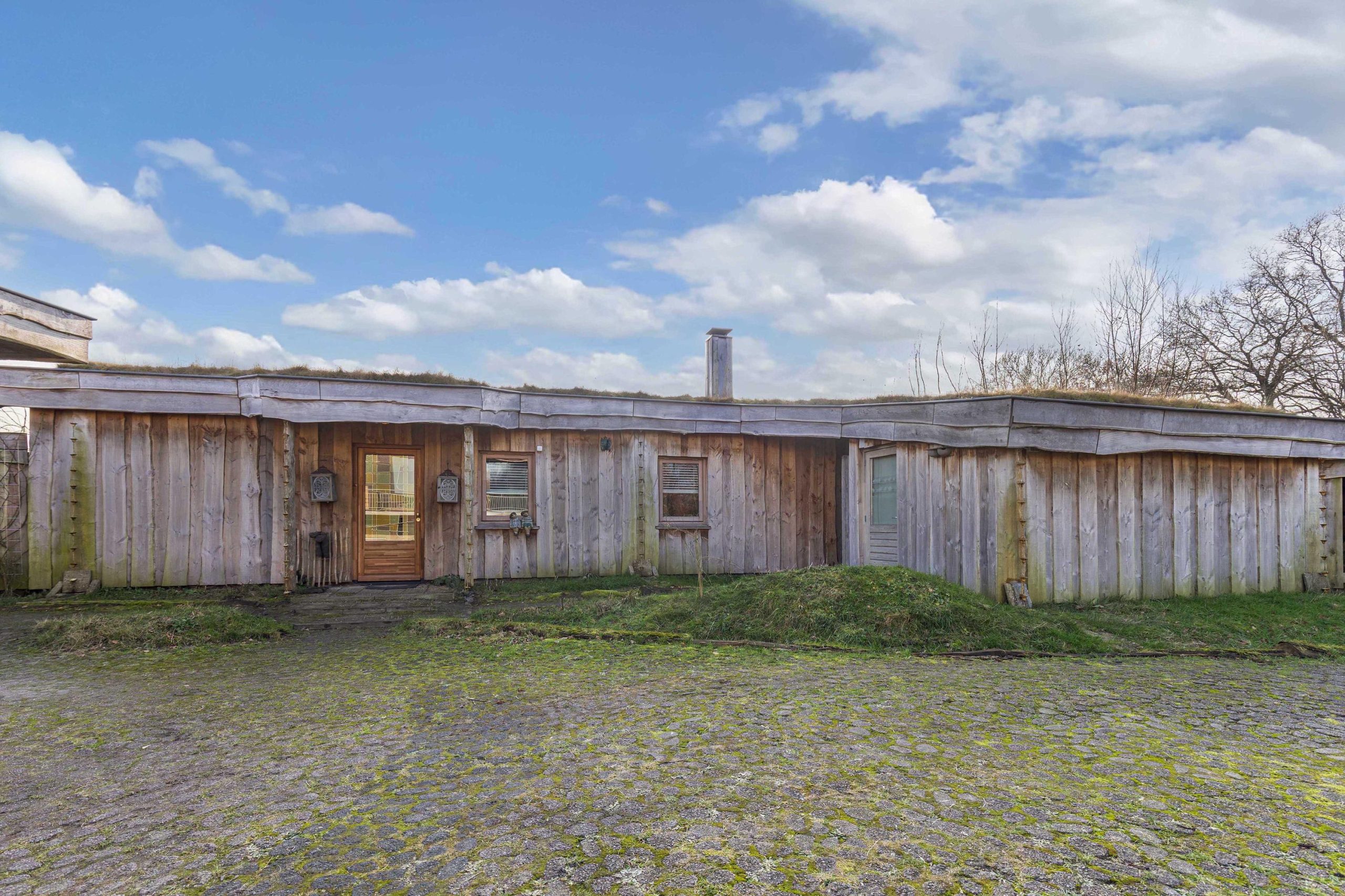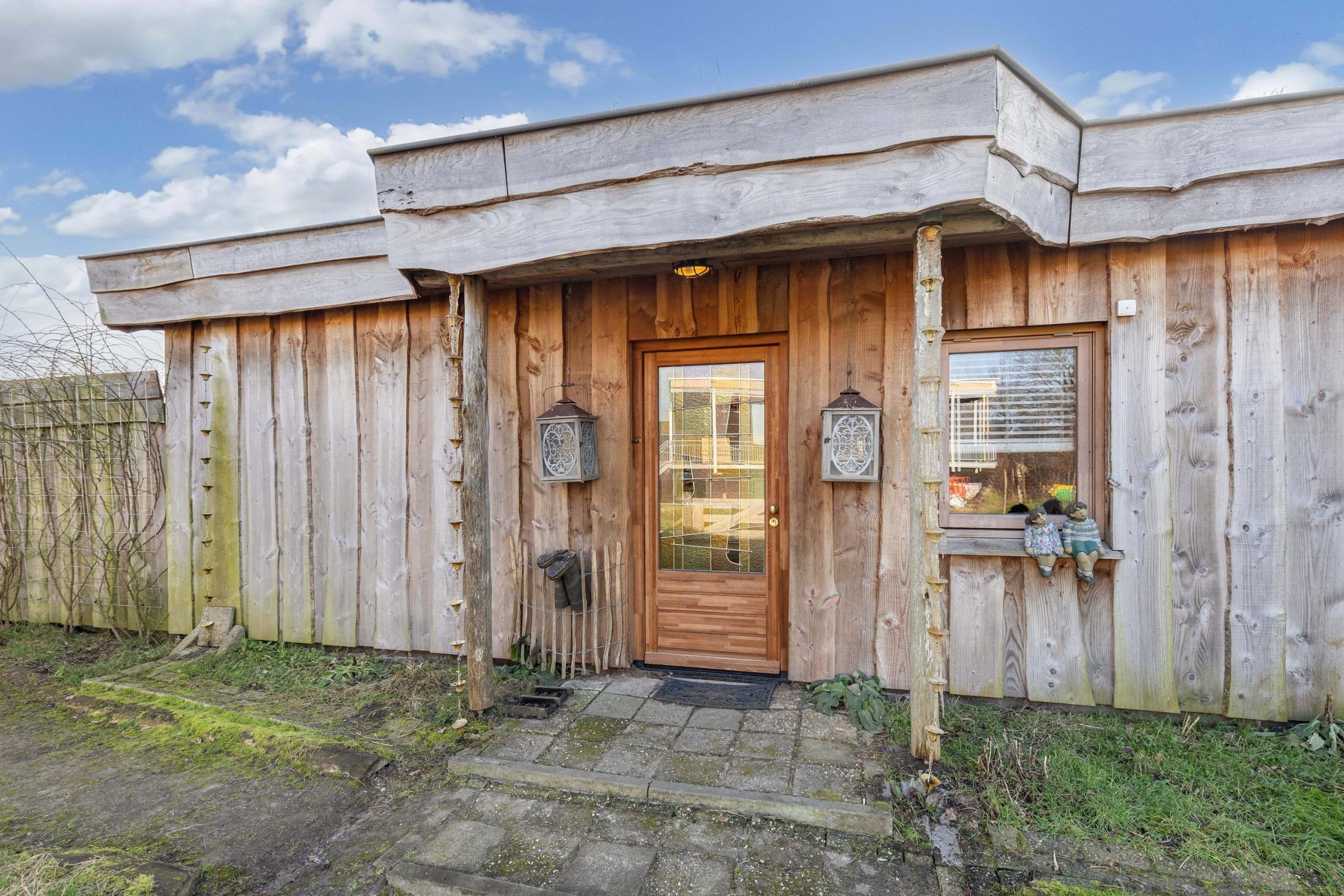 Het huis heeft tweede hands binnen- en kastdeuren en het glas in koper in de voordeur is oud. De houten vloeren zijn tweedehands en de bestrating rondom het huis en de zitjes zijn ook tweedehands.