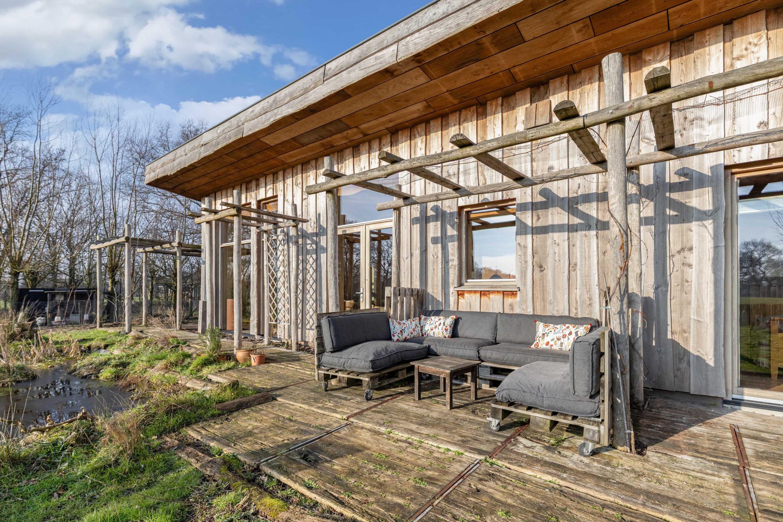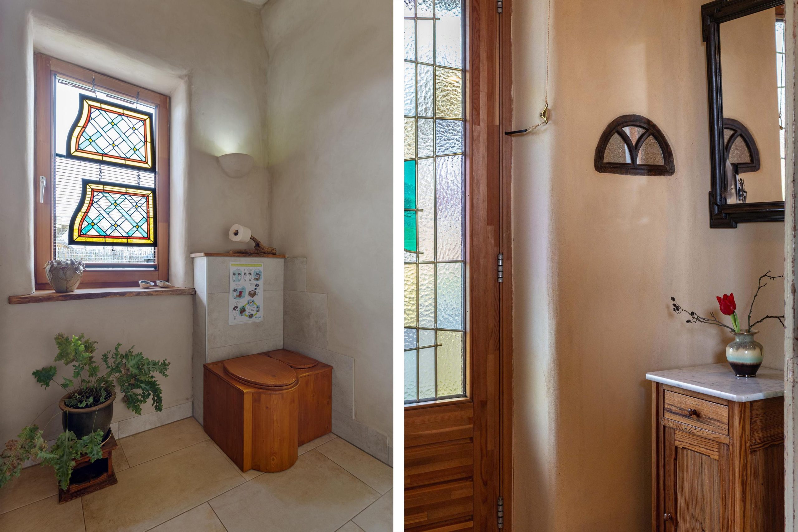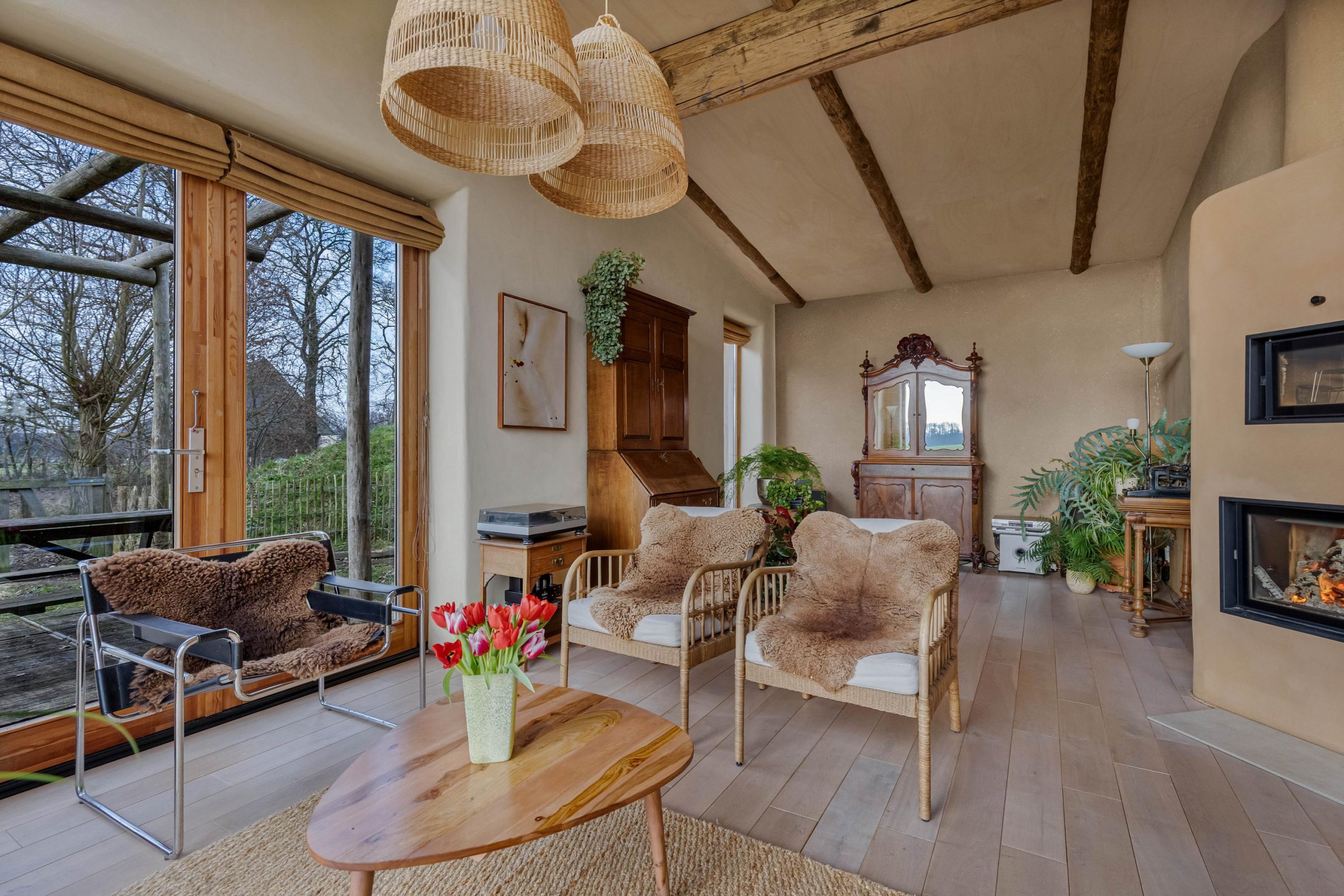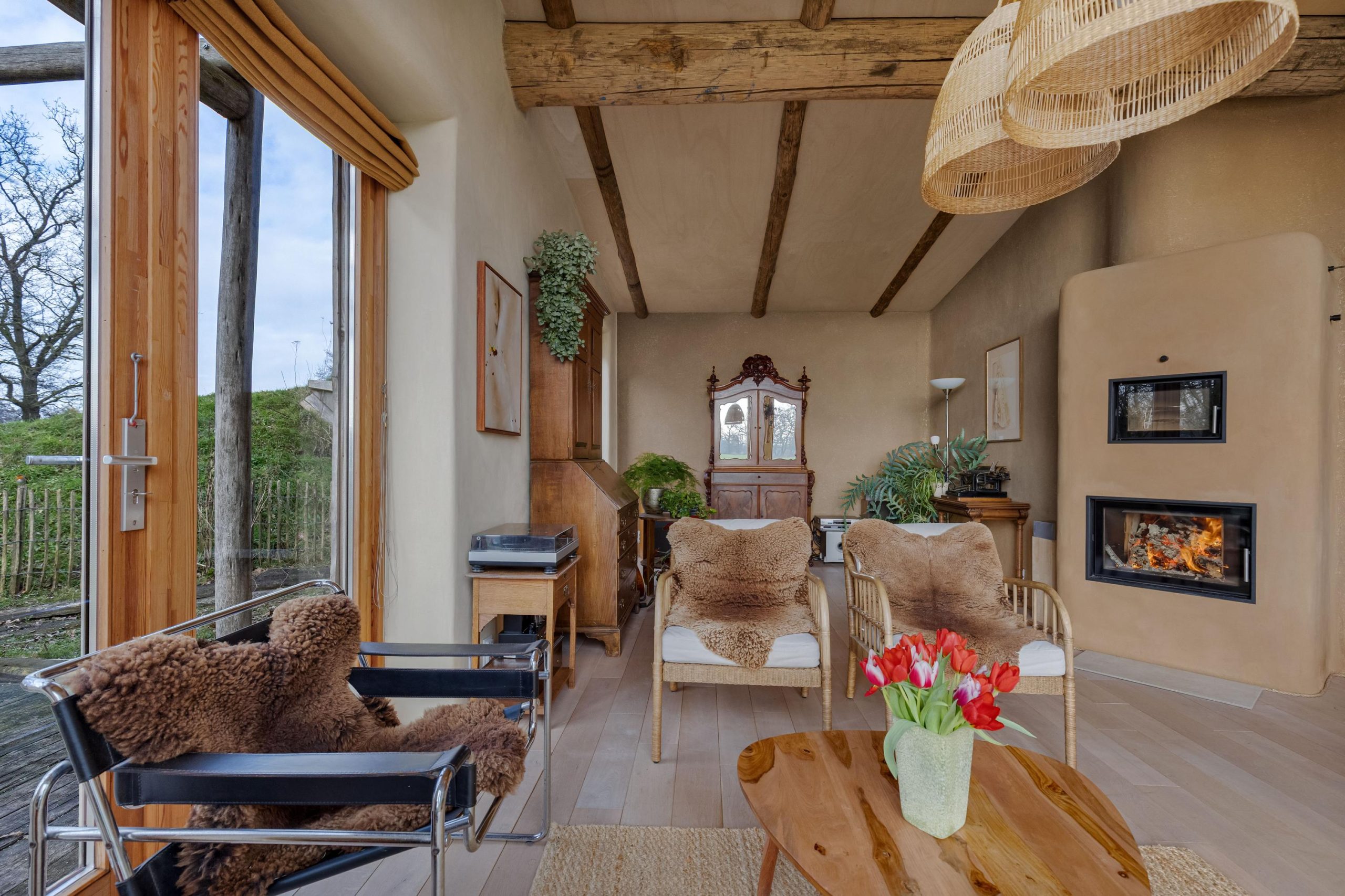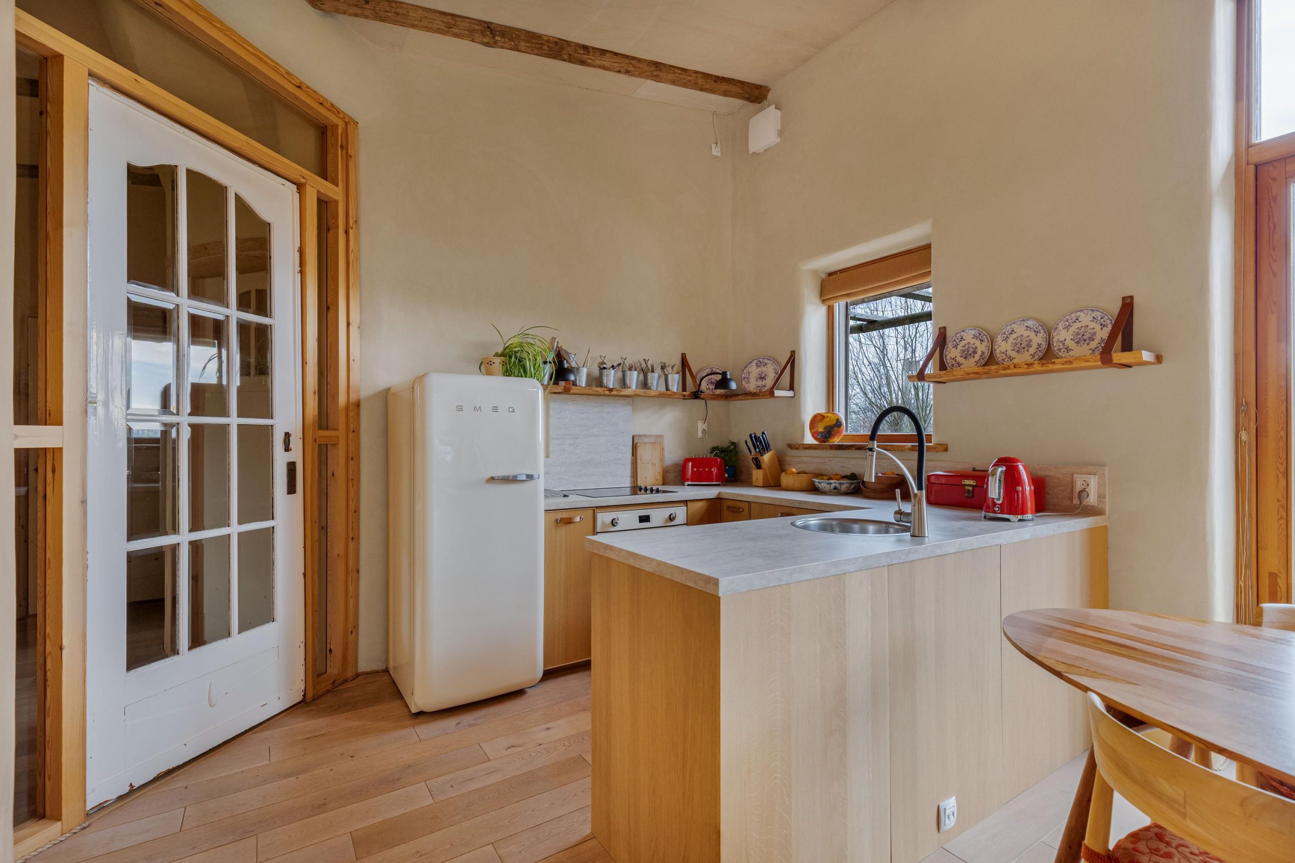 Het huis heeft tweede hands binnen- en kastdeuren en het glas in koper in de voordeur is oud. De houten vloeren zijn tweedehands en de bestrating rondom het huis en de zitjes zijn ook tweedehands.