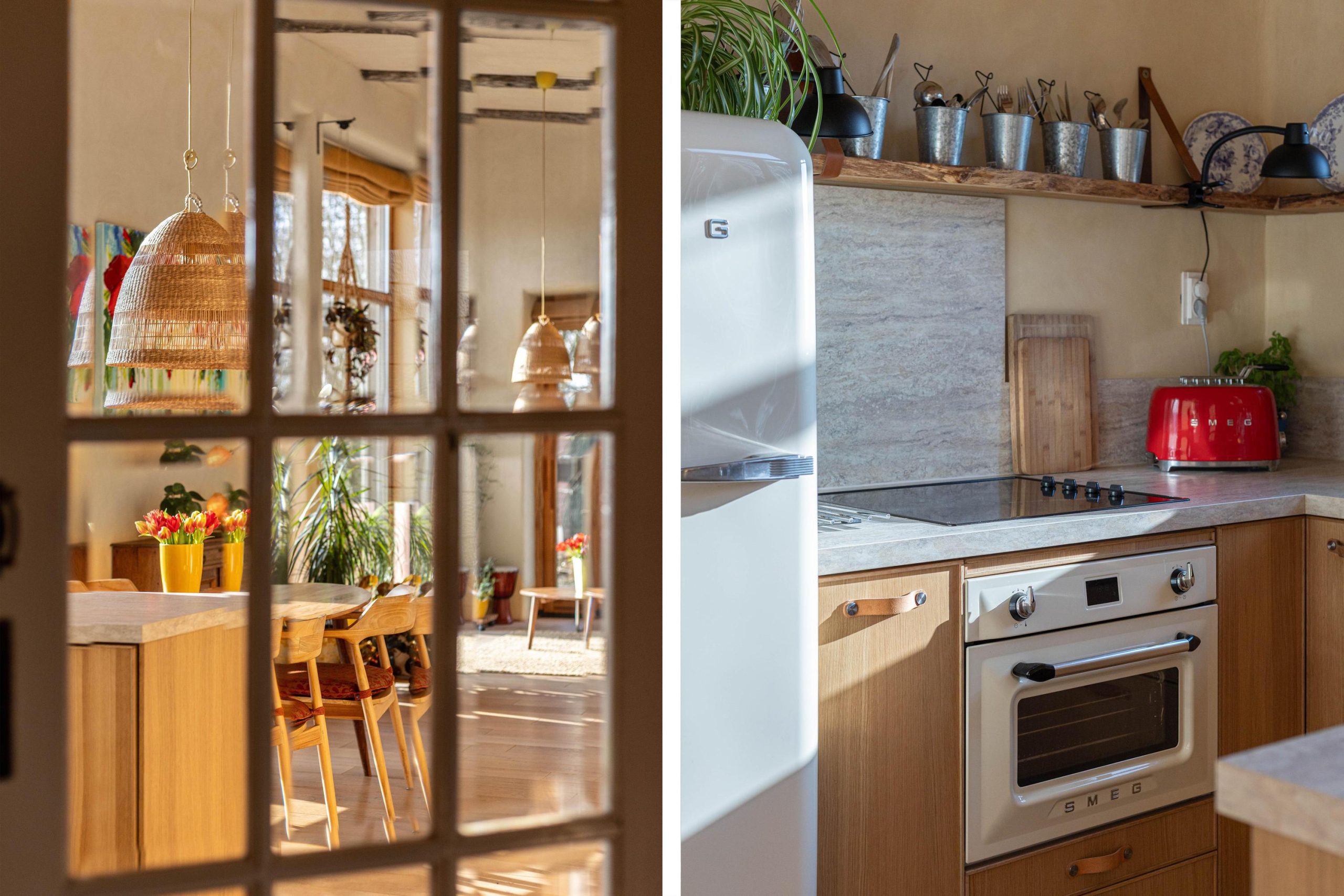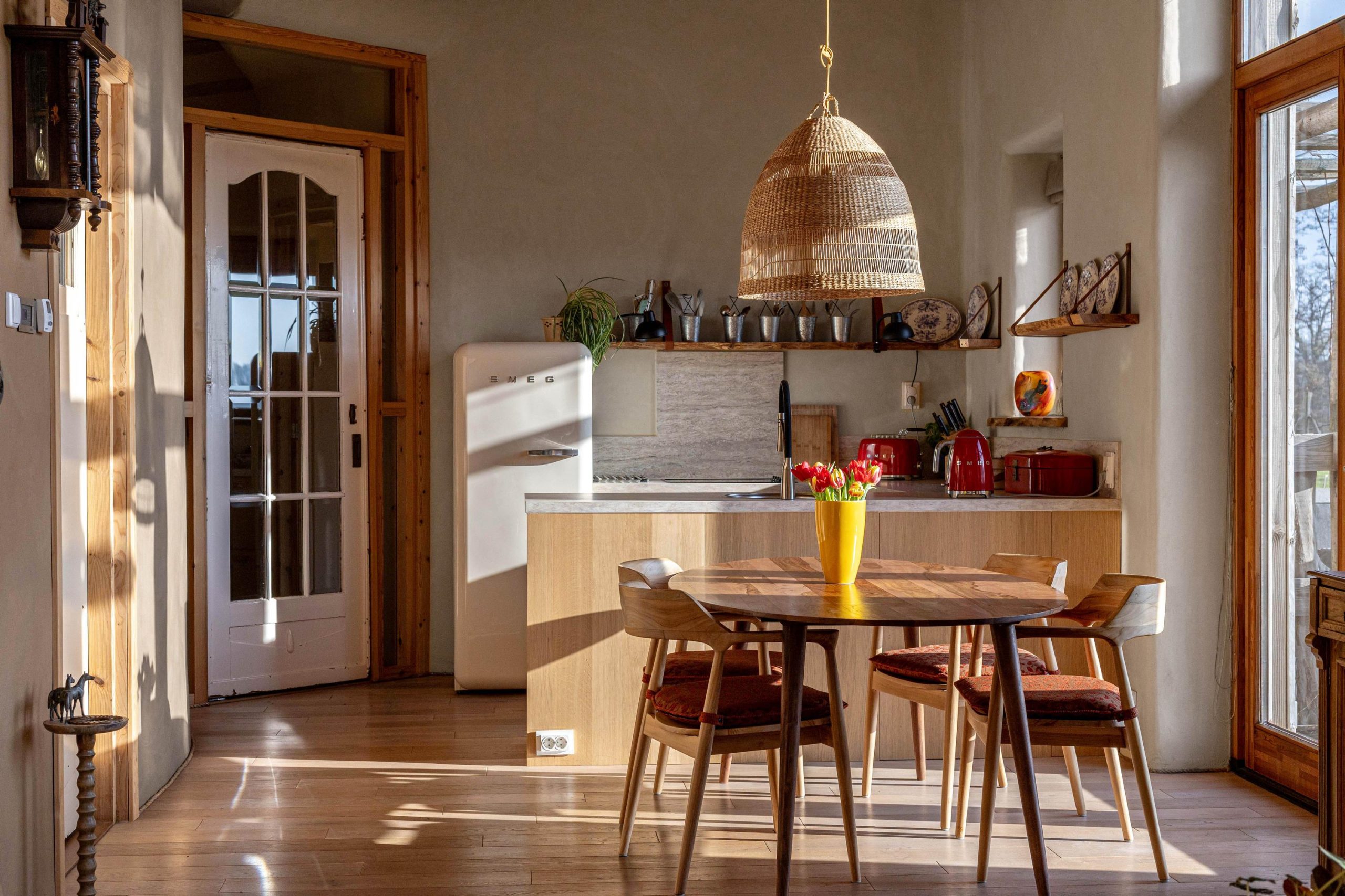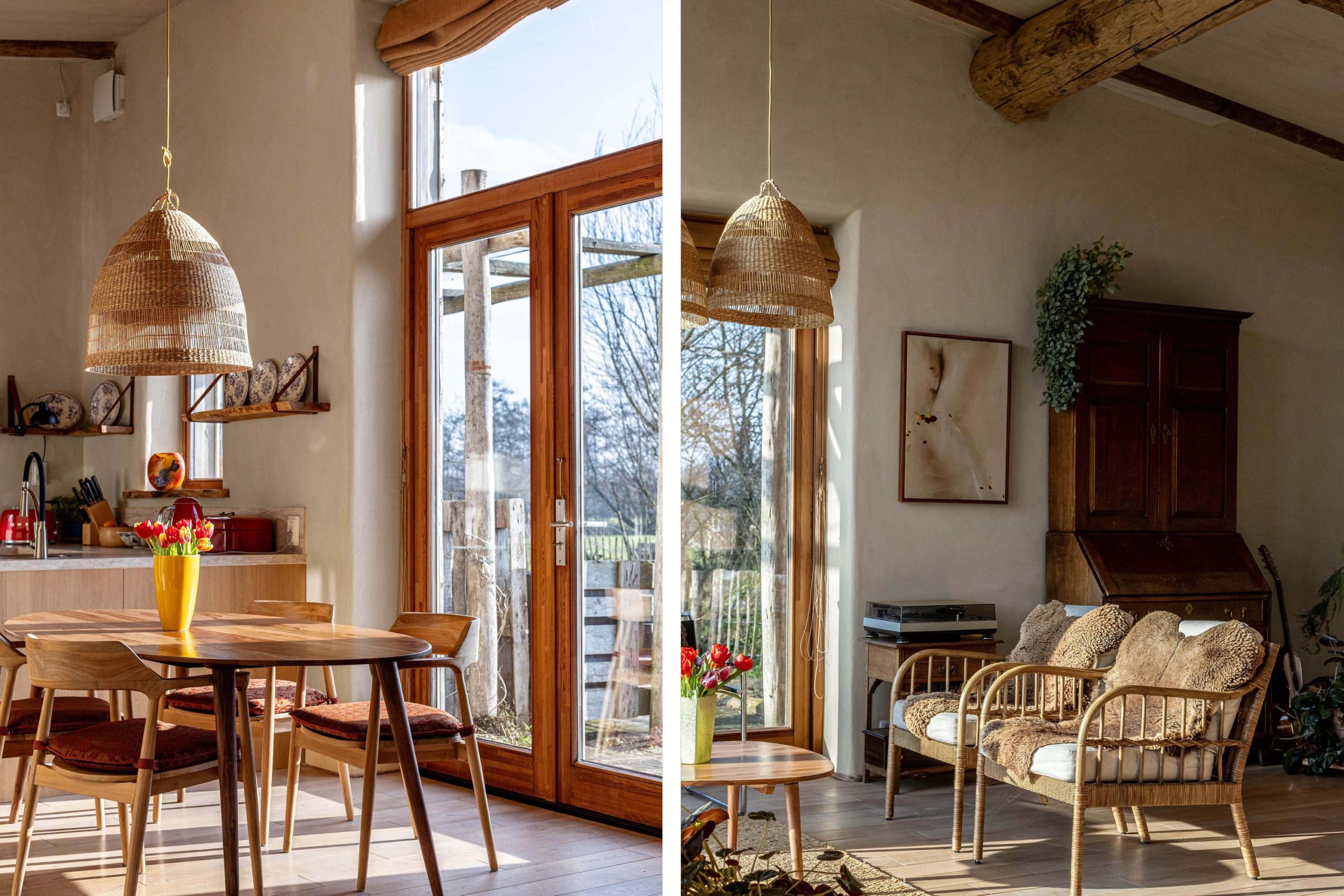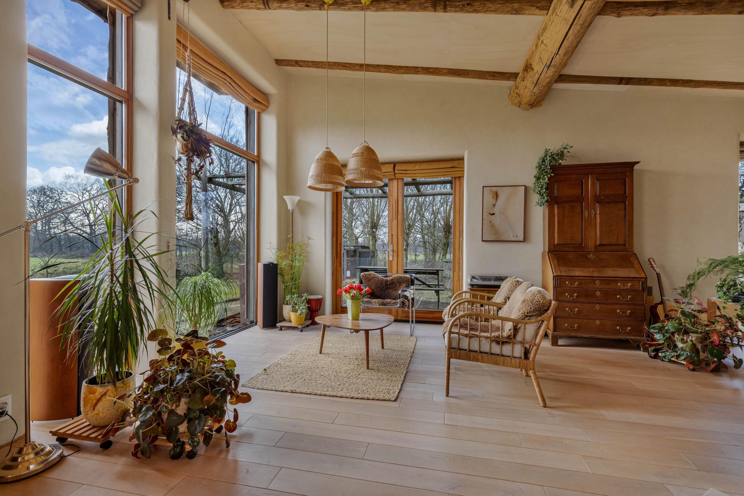 Het huis heeft tweede hands binnen- en kastdeuren en het glas in koper in de voordeur is oud. De houten vloeren zijn tweedehands en de bestrating rondom het huis en de zitjes zijn ook tweedehands.