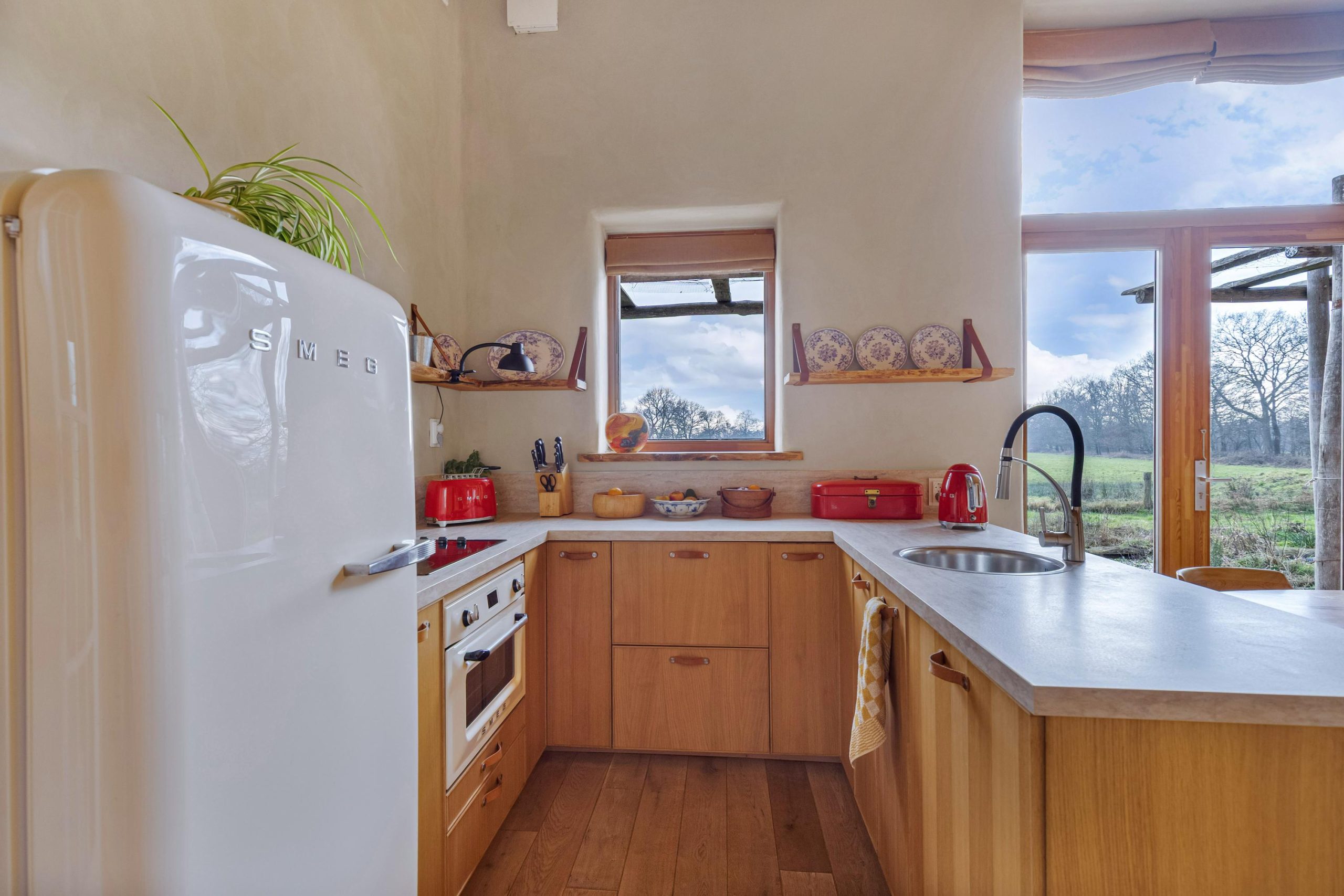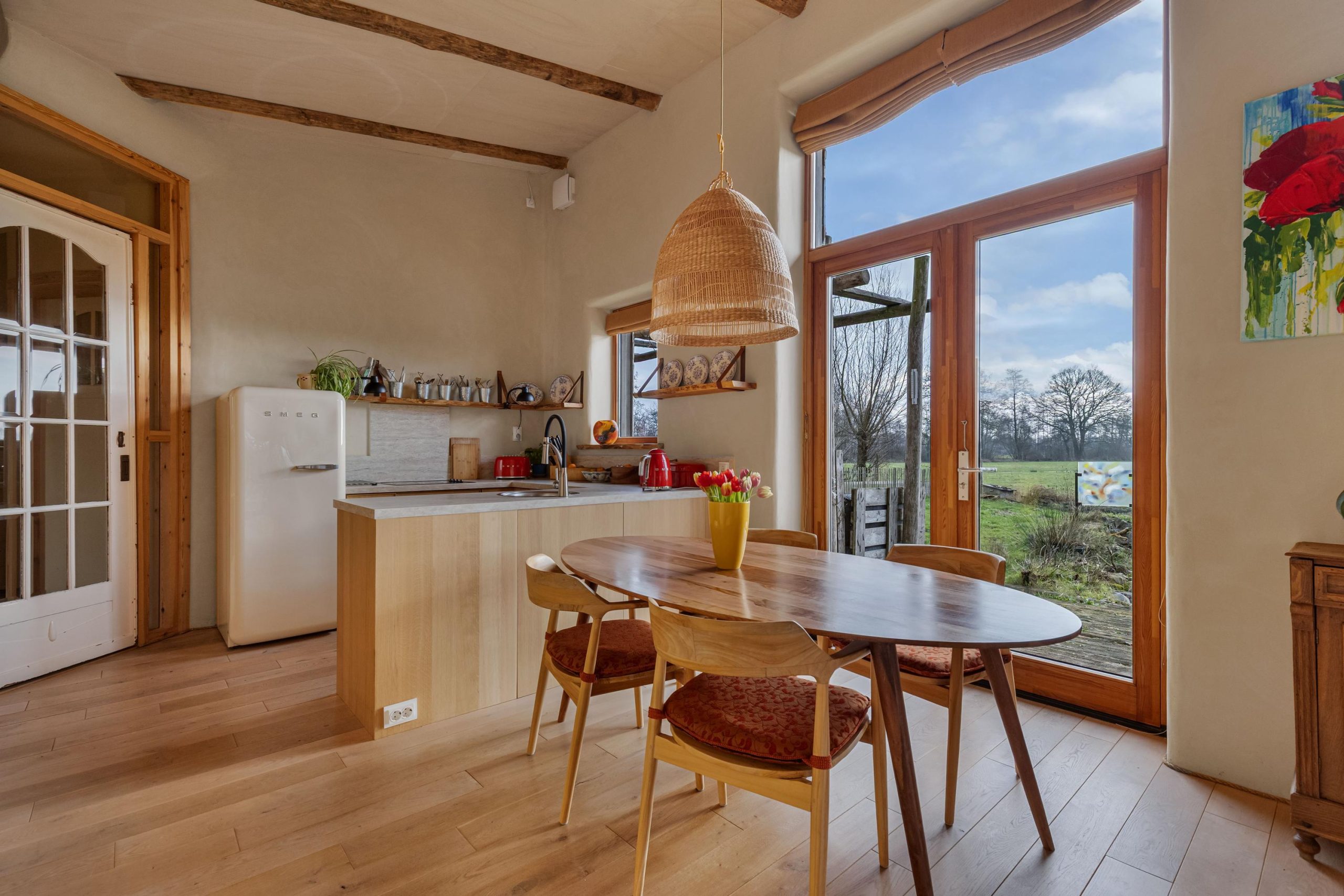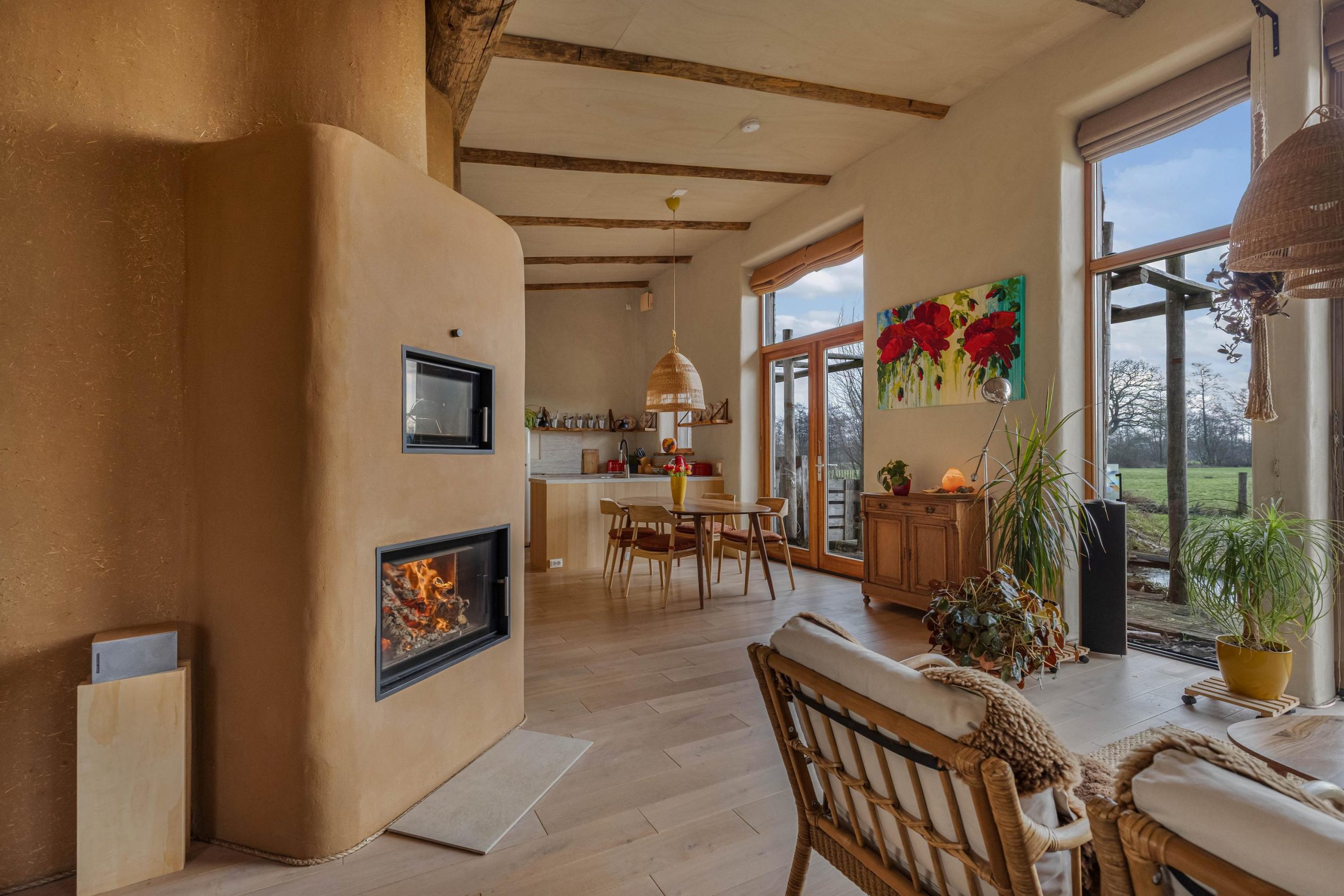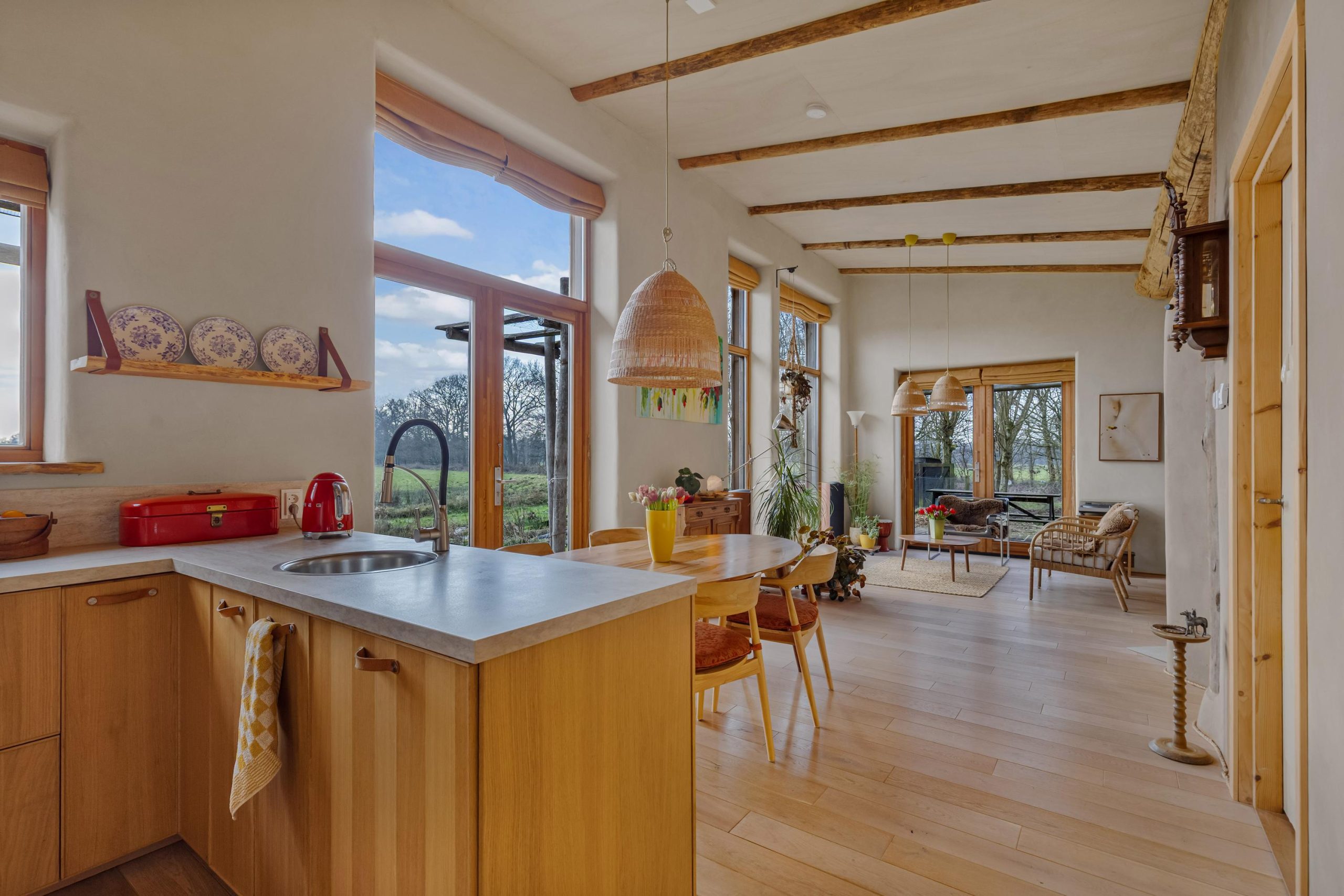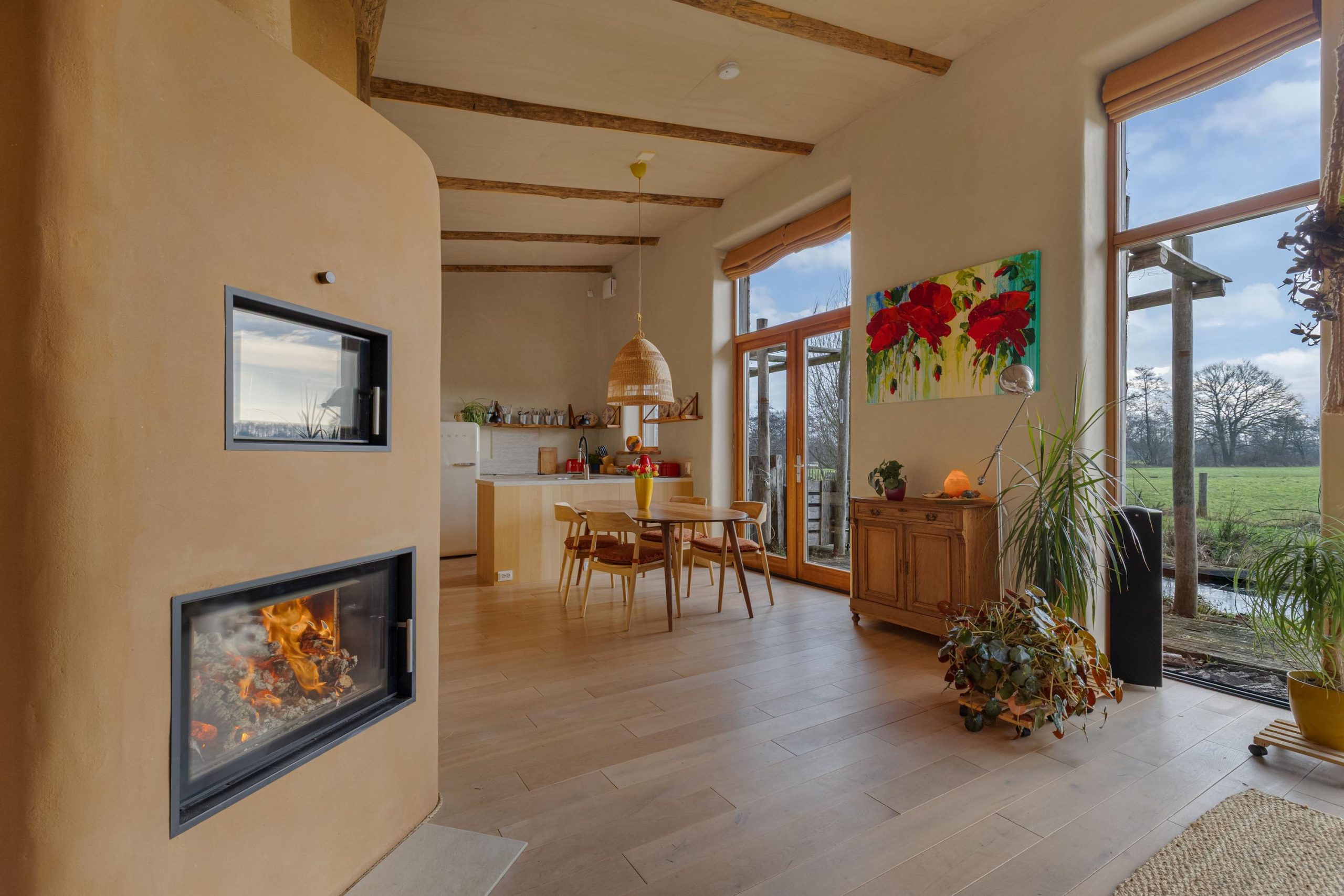 Bij binnenkomst valt je oog direct op het weidse panorama over de landerijen. Je weet dat je op een bijzondere plek bent. Het licht valt vanuit het zuiden prachtig naar binnen door de hoge ramen. De leefruimte is opgedeeld in een TV/zithoek, leeshoek en een plek voor de eettafel bij de open keuken en de openslaande tuindeuren. Waar je ook zit in de leefruimte, je voelt je verbonden met buiten en de landelijke omgeving waar je deel van uitmaakt. De keukenopstelling heeft een werkblad op prettige werkhoogte en beschikt over een vaatwasser, een keramische kookplaat, een spoelkraan met 5 liter boiler en soft-close lades en kasten. De losse koelkast en stoomoven gaan mee met de bewoners naar hun nieuwe huis. De woning wordt verwarmd door de vloerverwarming, maar je kunt ook kiezen voor de zeer zuinige leemkachel. Met slechts 1 kratje hout per dag geniet je de hele dag van comfortabele warmte in de hele leefruimte!