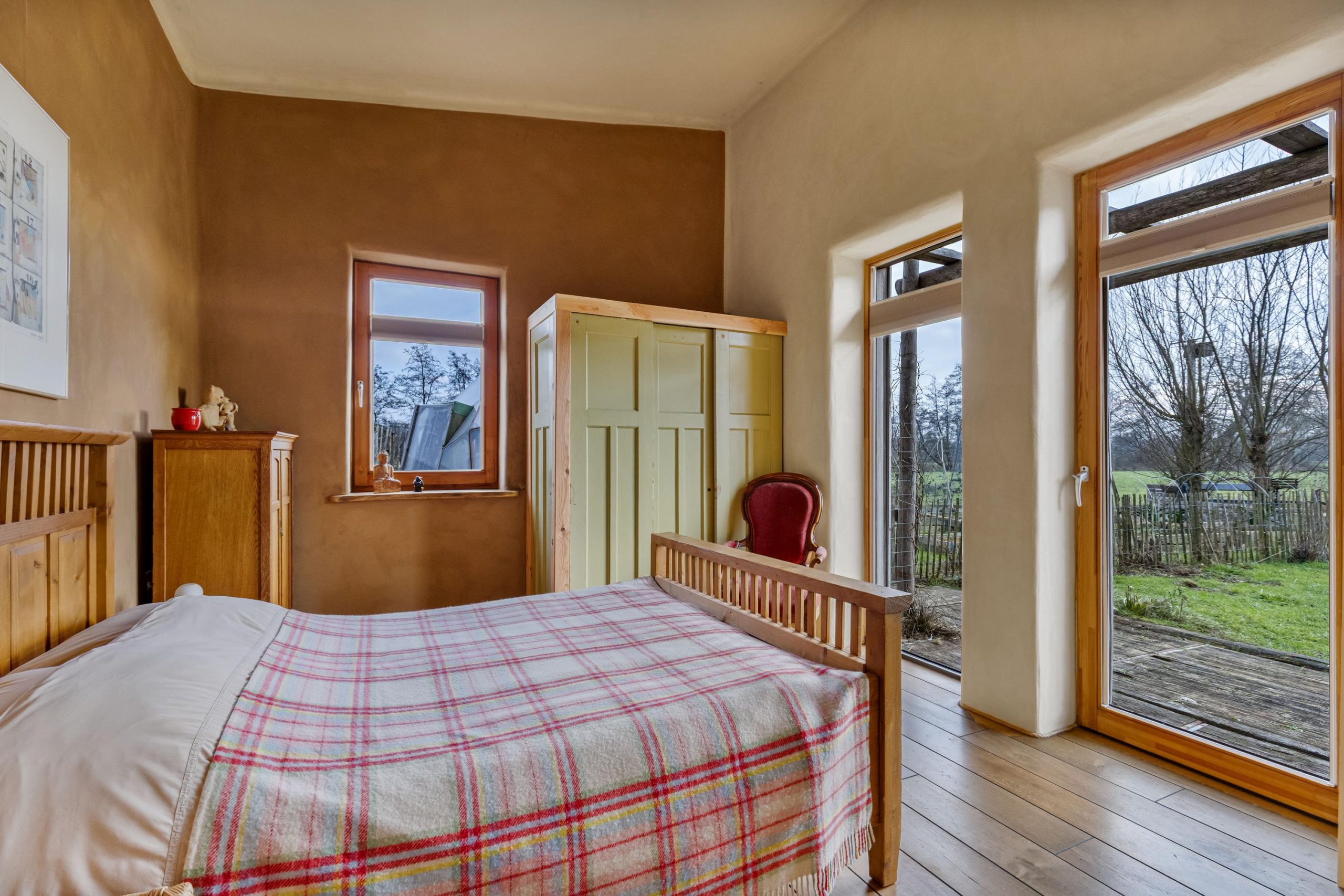 Een royale tweepersoonsslaapkamer met tuindeur naar de achtertuin. Voorzien van luxe top-down raamdecoratie. Doordat de slaapkamer en de badkamer op de begane grond zijn, is het woonhuis ook levensloopbestendig.