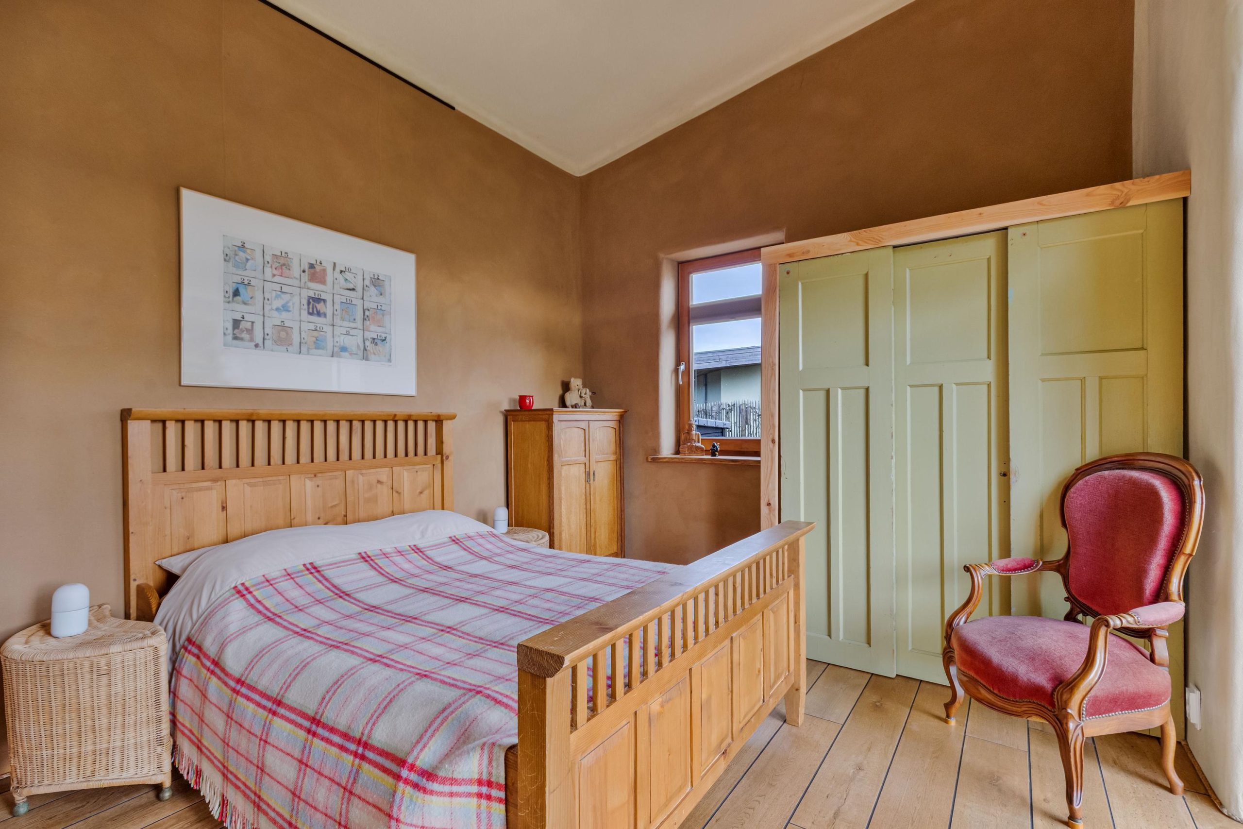 Vanuit de woonkamer bereikbaar, deze slaapkamer. Ook als sideroom, hobbykamer of werkkamer uitstekend te gebruiken. Met vier vaste kasten en een parketvloer.