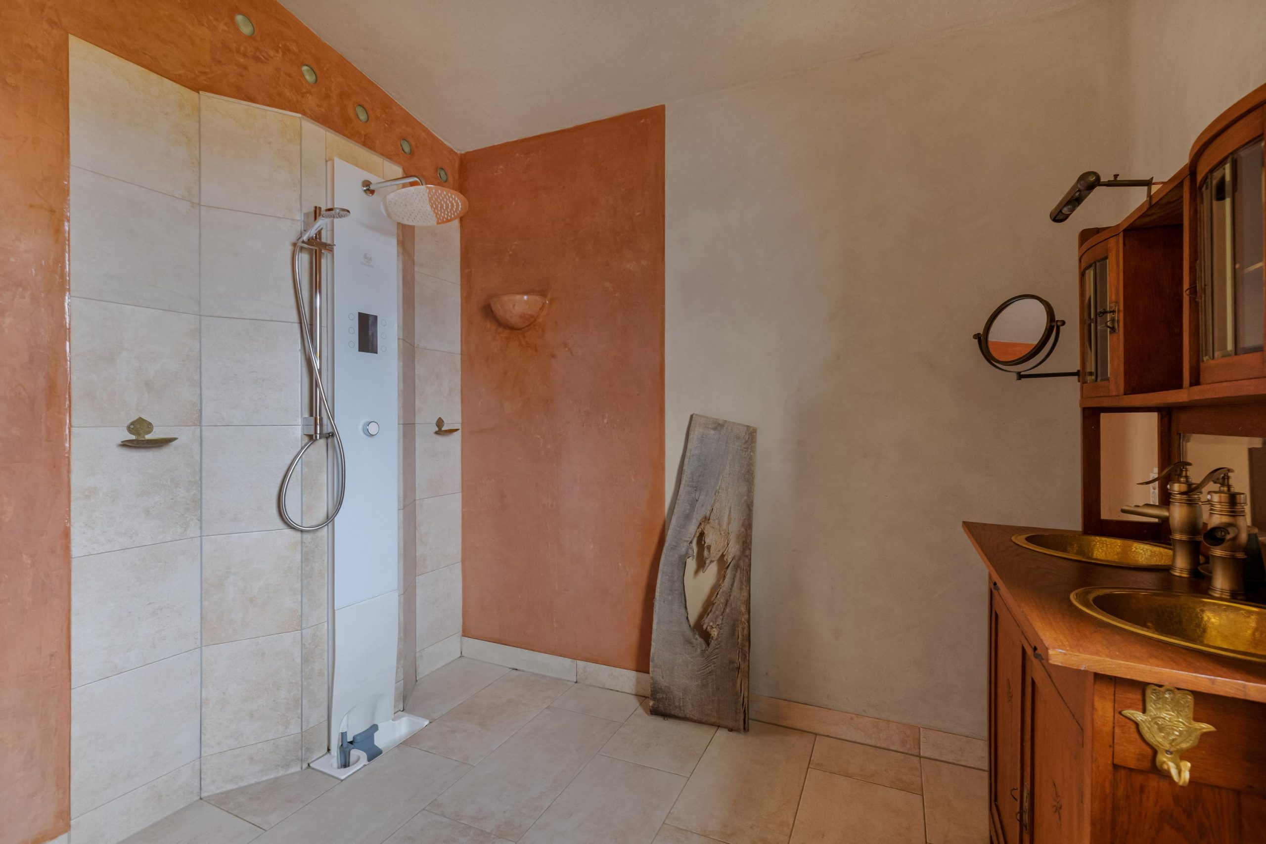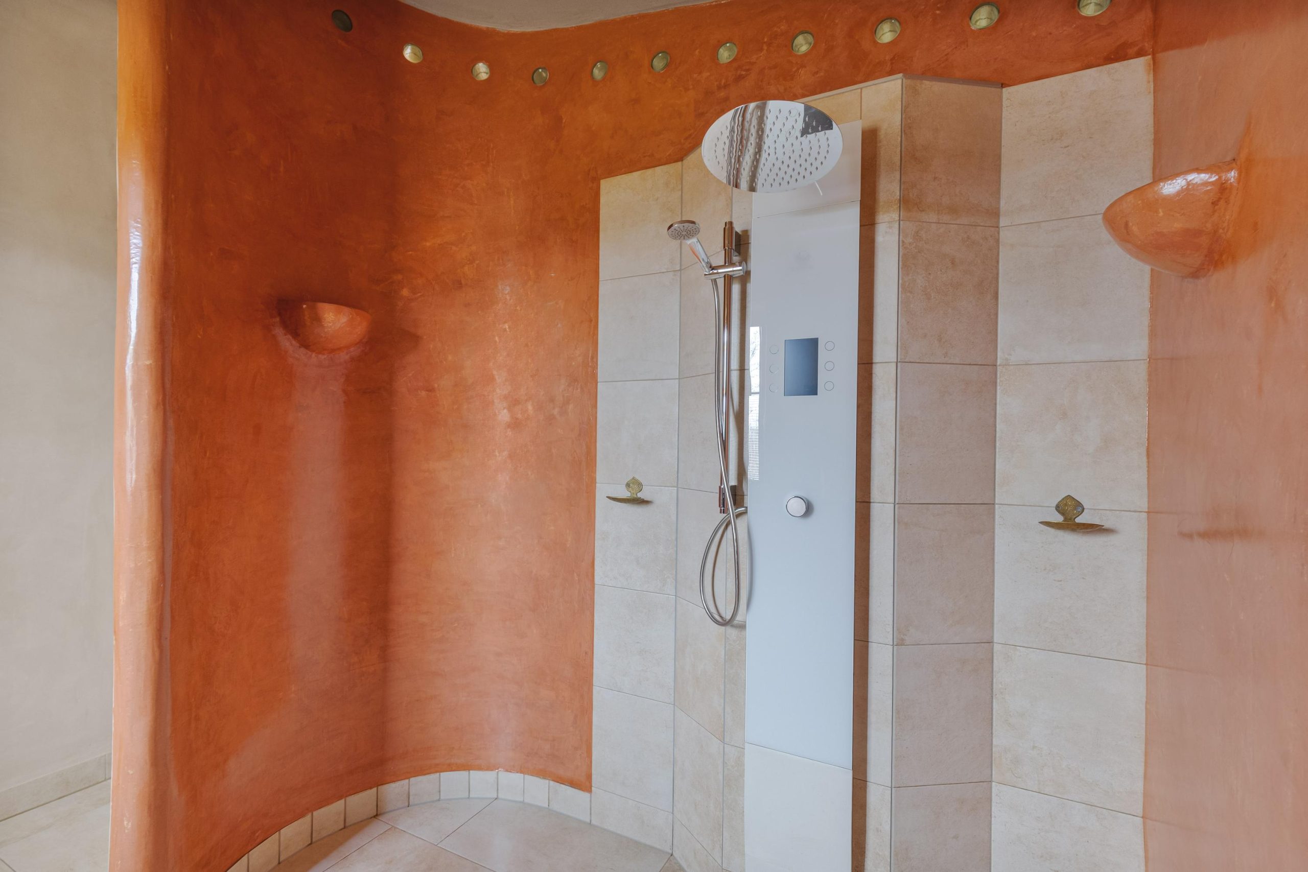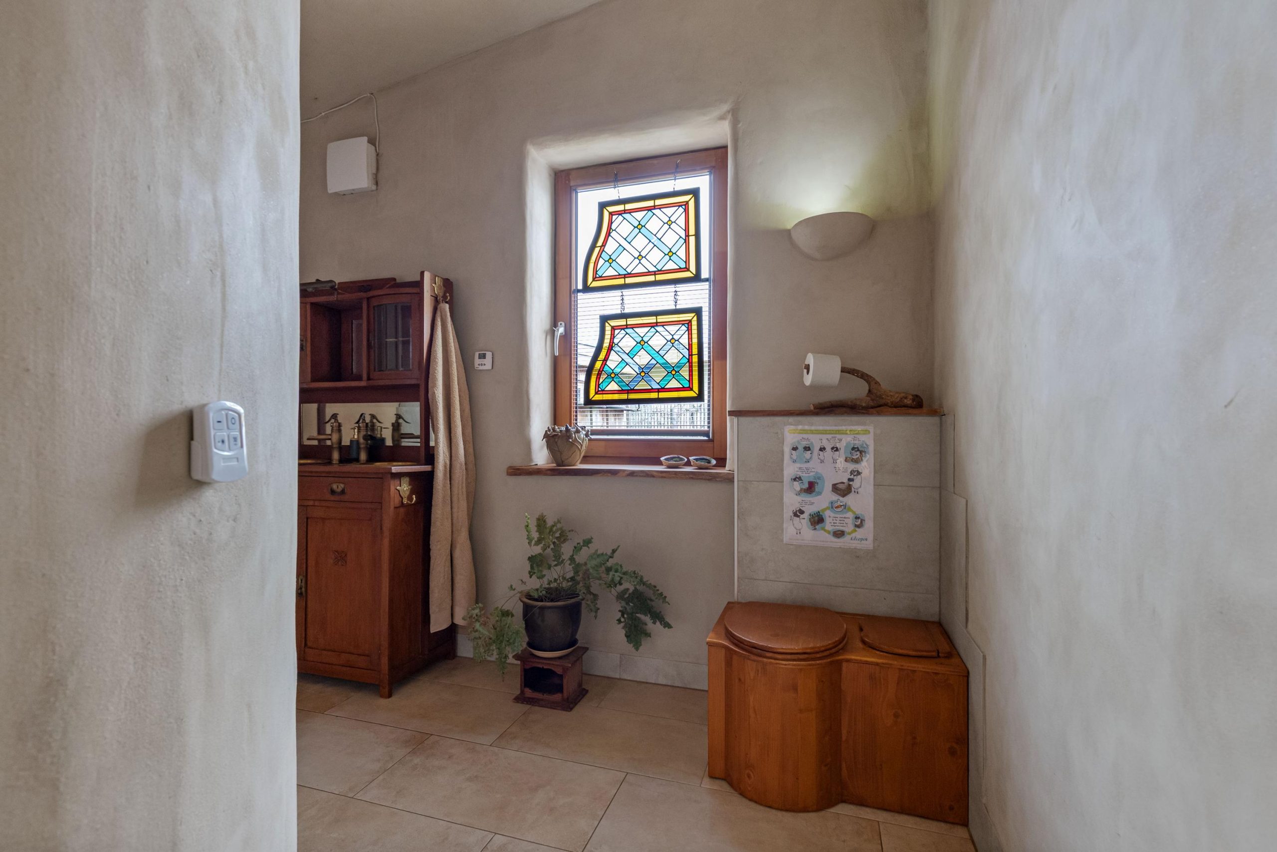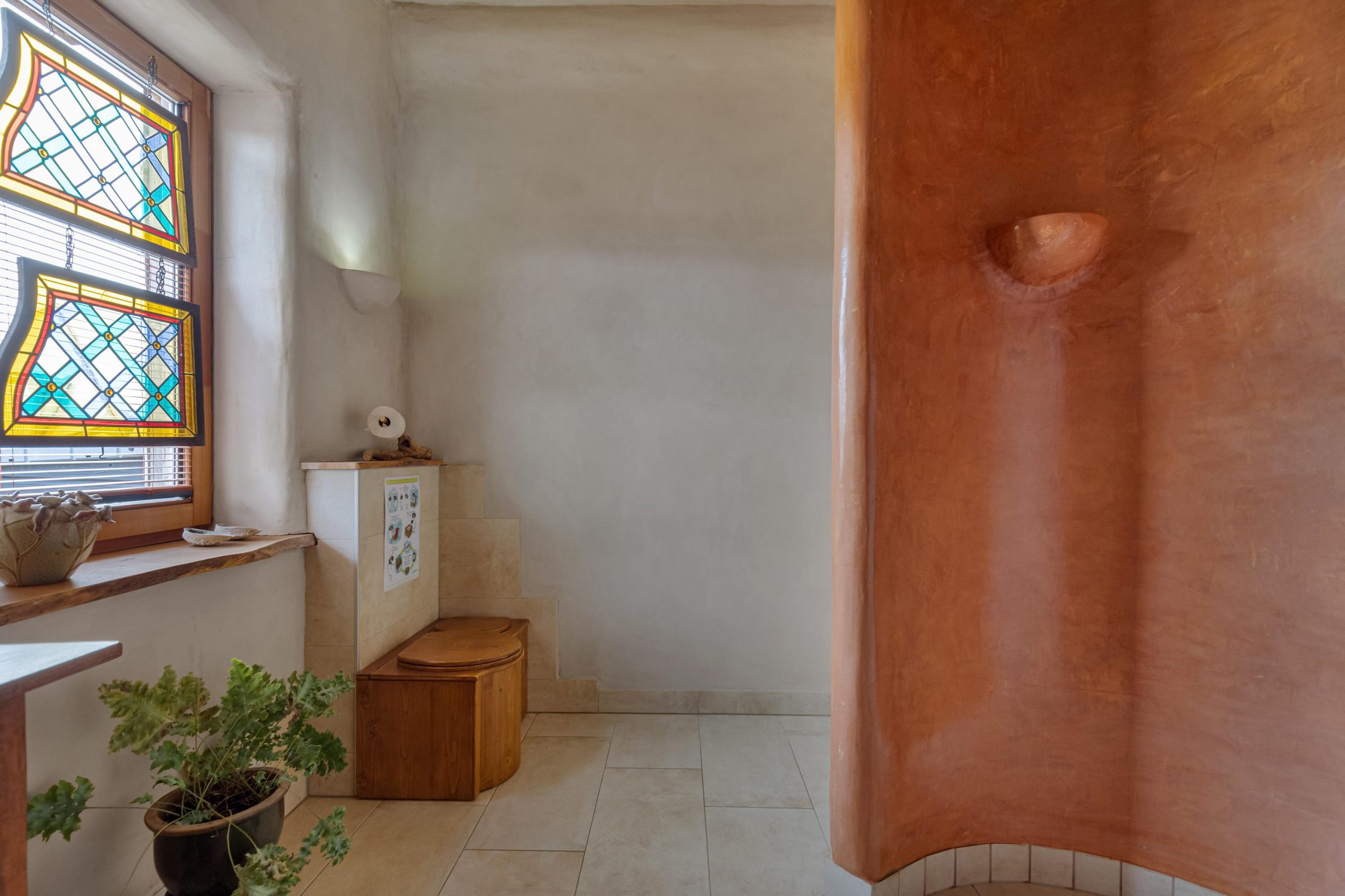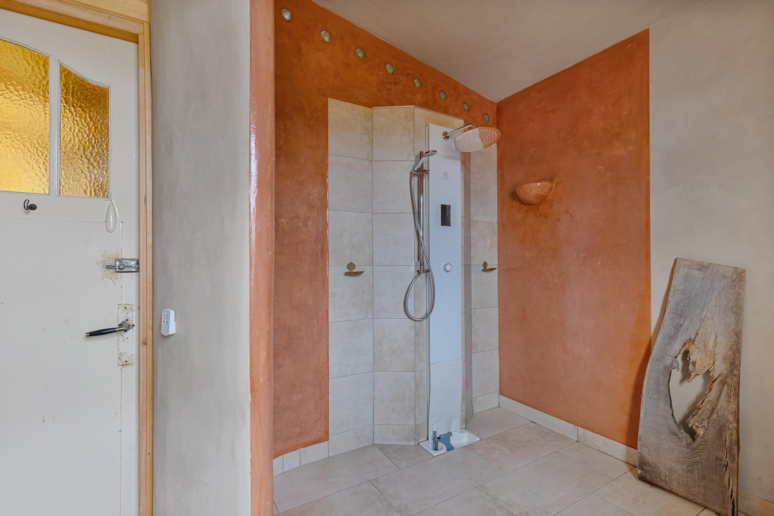 Fraai vormgegeven badkamer met een zeer ruime en luxe inloopdouche voorzien van regendouche en handdouche. Het betreft een waterbesparende Hamwells douche-installatie met UV-lamp en wifi-mogelijkheid, en waarbij het douchewater wordt gefilterd en hergebruikt! Het toilet is nu een droogtoilet maar de aansluitingen voor een wandcloset zijn aanwezig.