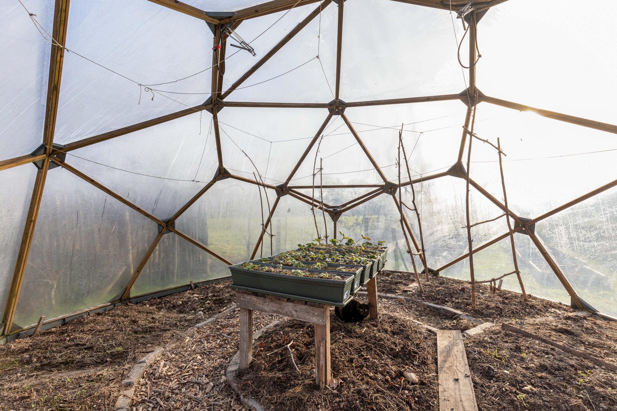 Er zijn 4 vijvers die met elkaar verbonden zijn. De maat van deze vijvers is ontstaan, omdat het EPDM van ons dak komt... Het EPDM was niet goed gelegd en moest er weer af. Zo kon het EPDM worden hergebruikt en hoefde het niet naar de stort. De tuin beschikt over veel fruitbomen en struiken. Er is ook een kas van het model Heliotroop. De naam komt uit het Grieks, van helios (zon) en trepein (draaien). Achter de kas ligt de moestuin. De moestuin met kas geeft je de mogelijkheid in je eigen groente te voorzien. Bij de kas zijn 2 ibc vaten. Ze worden gevuld met water in de regenperiode. Zo is er voldoende water voor de planten als het droog is. De heuvel is zo aangelegd dat hij vanaf de weg het zicht op het huis enigszins ontneemt. Zeker als in de zomer de planten op de heuvel hoog zijn, valt het huis er achter weg. Het huis verdwijnt in de natuur, zoals we zo graag wilden.