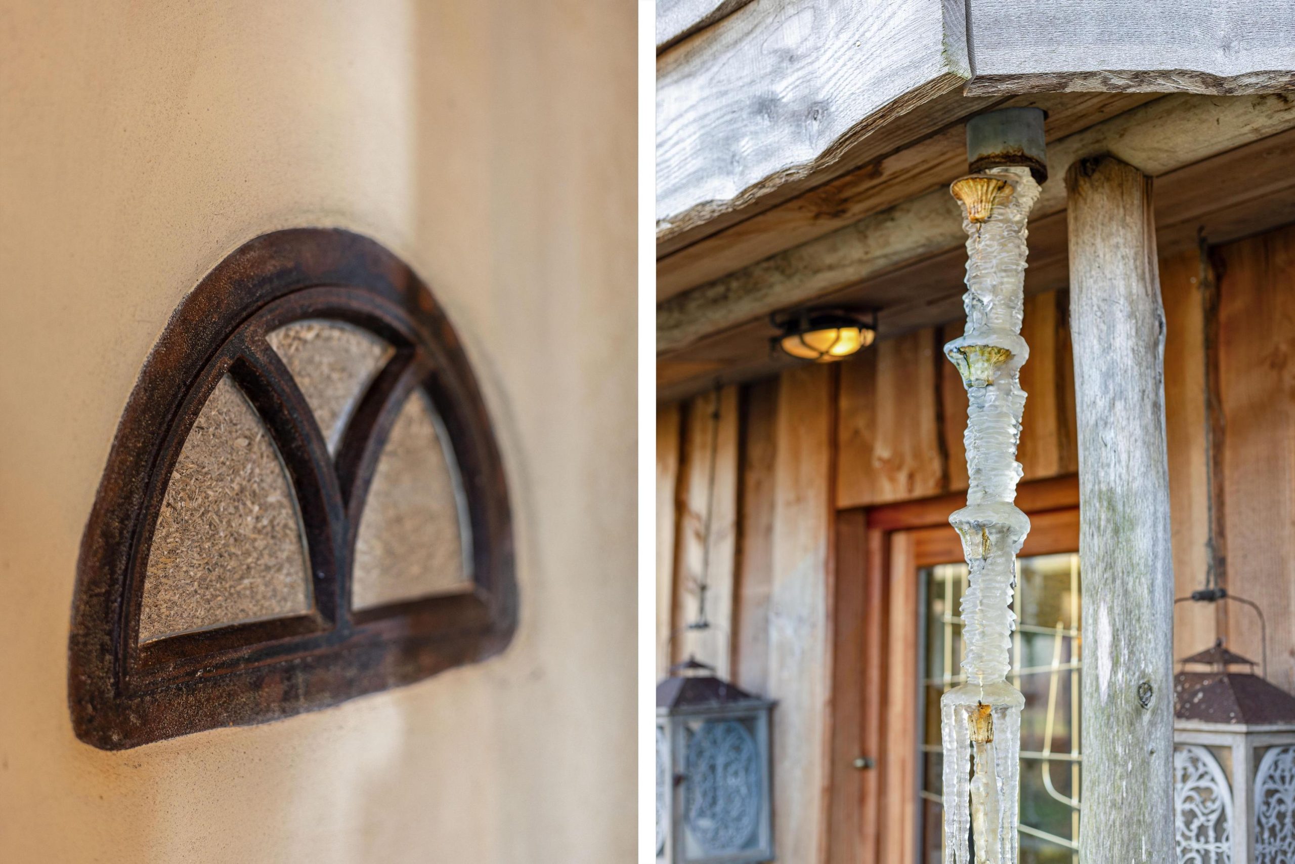 Aan het huis, op het zuiden, zit een groot overstek. Deze is zo door de architect ontworpen dat de zomerzon slechts een klein beetje in huis komt. De winterzon kan door de grote ramen op het zuiden tot helemaal achterin het huis komen en helpt mee met het verwarmen van het huis in de winter. De ramen op het noorden zijn bewust klein, omdat dat de koude kant van het huis is. Het water van het dak loopt langs regenkettingen naar beneden. Binnen de leer van Feng Shui is water het element van levensenergie. Stromend water trekt namelijk de positieve energie (welvaart energie) aan. Goed voor bij de voordeur. In de muur tussen de hal en de badkamer hebben we een flessenmuur. Het zijn bodems van Demeter gefermenteerd groentesap van de Ekoplaza.