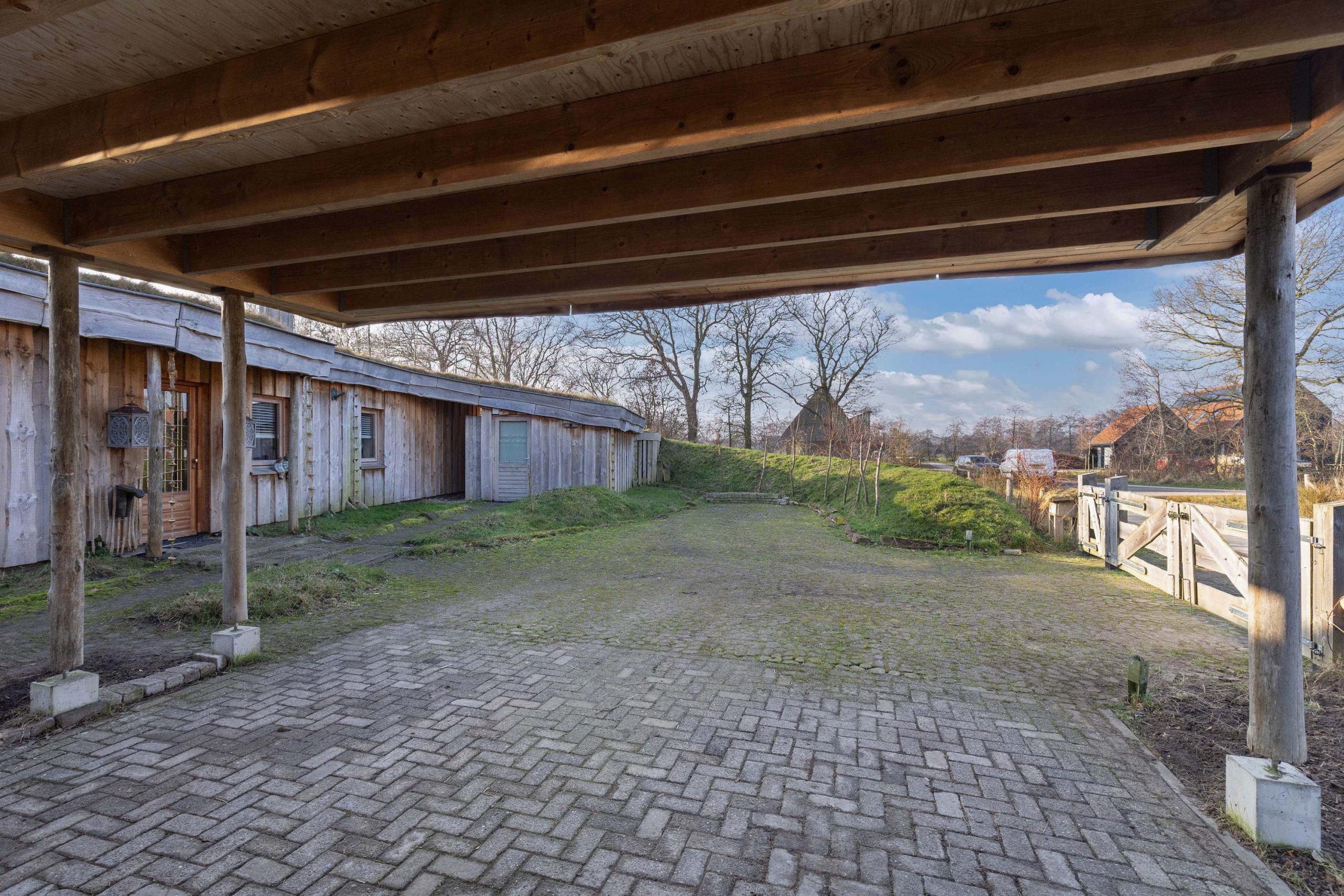 Een berging met brede carport voor twee auto's, in de stijl van het huis gebouwd. De berging biedt veel ruimte voor je fietsen en tuinspullen. Ook is hier een loodaccu met 23 cellen (en 1 reserve) geplaatst voor de opslag van elektriciteit ten behoeve van het huis. Ook is er een tweede vrijstaande houten berging. De kas in de achtertuin geeft je de mogelijkheid zelf groente en fruit te verbouwen.